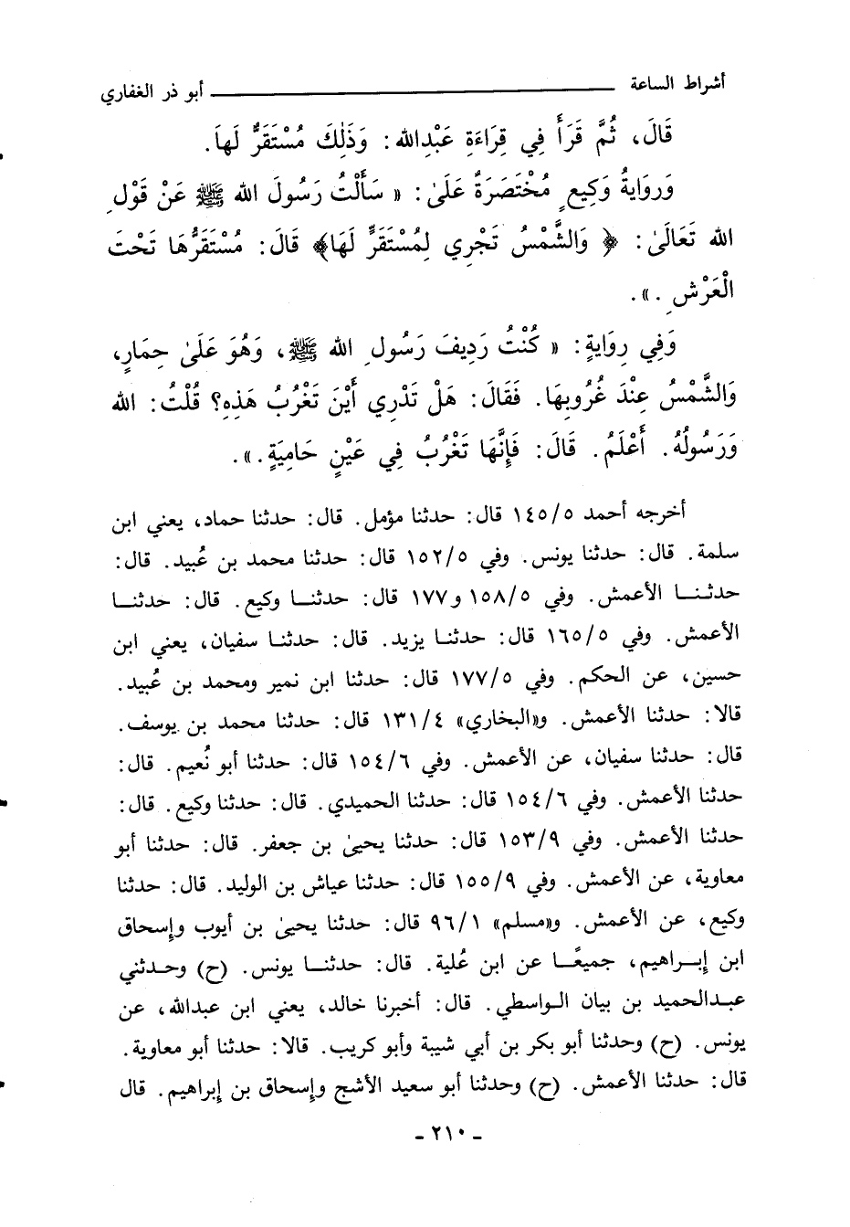 - وفي رواية: سَأَلْتُ النَّبِيَّ صلى الله عليه وسلم عَنْ قَوْلِهِ تَعَالَى: "وَالشَّمْسُ تَجْرِي لِمُسْتَقَرٍّ لَهَا) قَالَ: مُسْتَقَرُّهَا تَحْتَ الْعَرْشِ.) ".