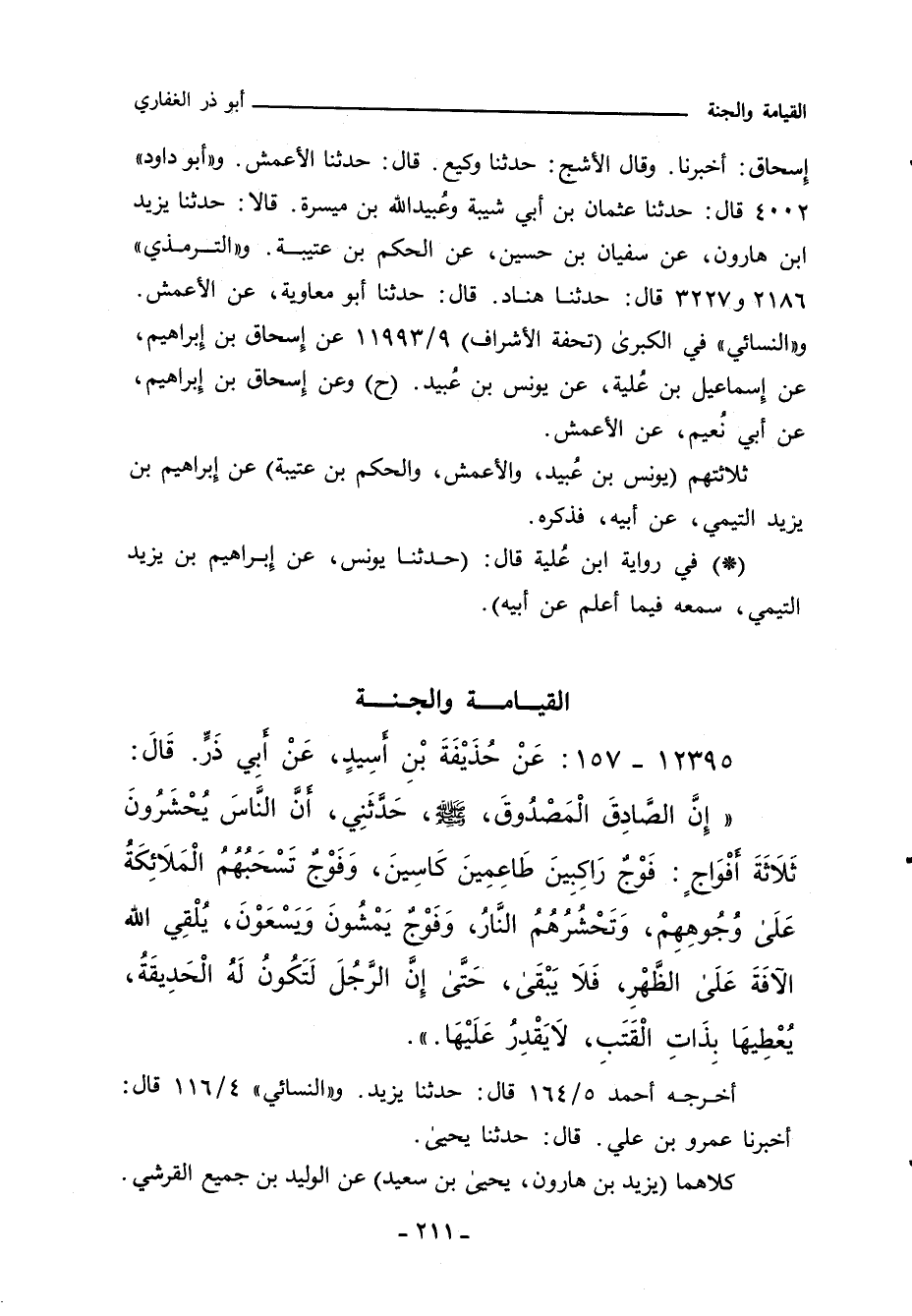 أَنَّ النَّاسَ يُحْشَرُونَ عَلَى ثَلَاثَةِ أَفْوَاجٍ: فَوجٌ رَاكِبِينَ طَاعِمِينَ كَاسِينَ، وَفَوْجٌ يَمْشُونَ وَيَسْعَوْنَ، وَفَوْجٌ تَسْحَبُهُمُ الْمَلَائِكَةُ عَلَى وُجُوهِهِمْ، وَتَحْشُرُهُمْ إِلَى النَّارِ، فَقَالَ قَائِلٌ مِنْهُمْ: هَذَانِ قَدْ عَرَفْنَاهُمَا، فَمَا بَالُ الَّذِينَ يَمْشُونَ وَيَسْعَوْنَ؟ قَالَ: يُلْقِي اللَّهُ الآفَةَ عَلَى الظَّهْرِ حَتَّى لَا يَبْقَى ظَهْرٌ، حَتَّى إِنَّ الرَّجُلَ لَيَكُونُ لَهُ الْحَدِيقَةُ الْمُعْجِبَةُ، فَيُعْطِيهَا بِالشَّارِفِ ذَاتِ الْقَتَبِ، فَلَا يَقْدِرُ عَلَيْهَا.