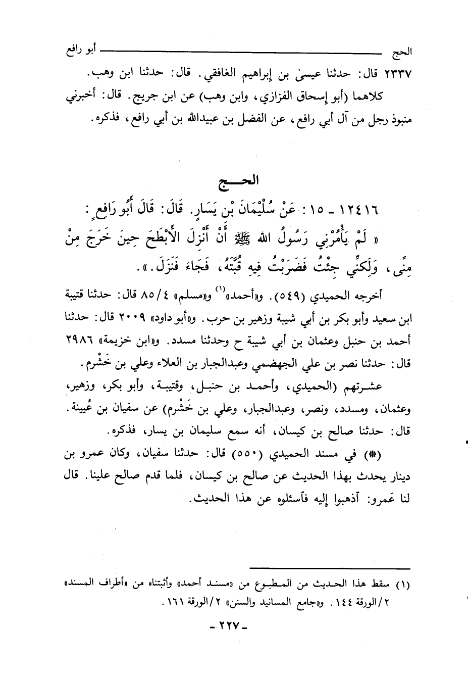 - وفي رواية: " عَنْ سُلَيْمَانَ بْنِ يَسَارٍ، قَالَ: إِنَّ أَبَا رَافِعٍ كَانَ عَلَى ثَقَلِ النَّبِيِّ صلى الله عليه وسلم، فَقَالَ: جِئْتُ فَضَرَبْتُ قُبَّتَهُ بِالأَبْطَحِ، فَجَاءَ فَنَزَلَ. ش