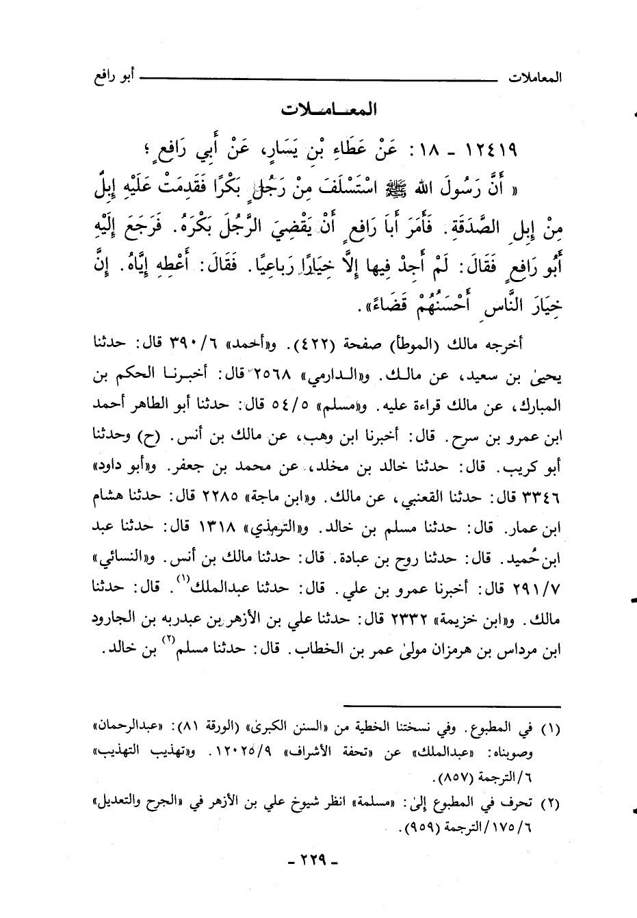 اسْتَسْلَفَ رَسُولُ اللهِ صلى الله عليه وسلم بَكْرًا، فَجَاءَتْهُ إِبِلٌ مِنَ الصَّدَقَةِ، قَالَ أَبُو رَافِعٍ: فَأَمَرَنِي رَسُولُ اللهِ صلى الله عليه وسلم أَنْ أَقْضِيَ الرَّجُلَ بَكْرَهُ، فَقُلْتُ: لَمْ أَجِدْ فِي الإِبِلِ إِلَاّ جَمَلاً خِيَارًا رَبَاعِيًا، فَقَالَ رَسُولُ اللهِ صلى الله عليه وسلم: أَعْطِهِ إِيَّاهُ، فَإِنَّ خِيَارَ النَّاسِ أَحْسَنُهُمْ قَضَاءً. ط