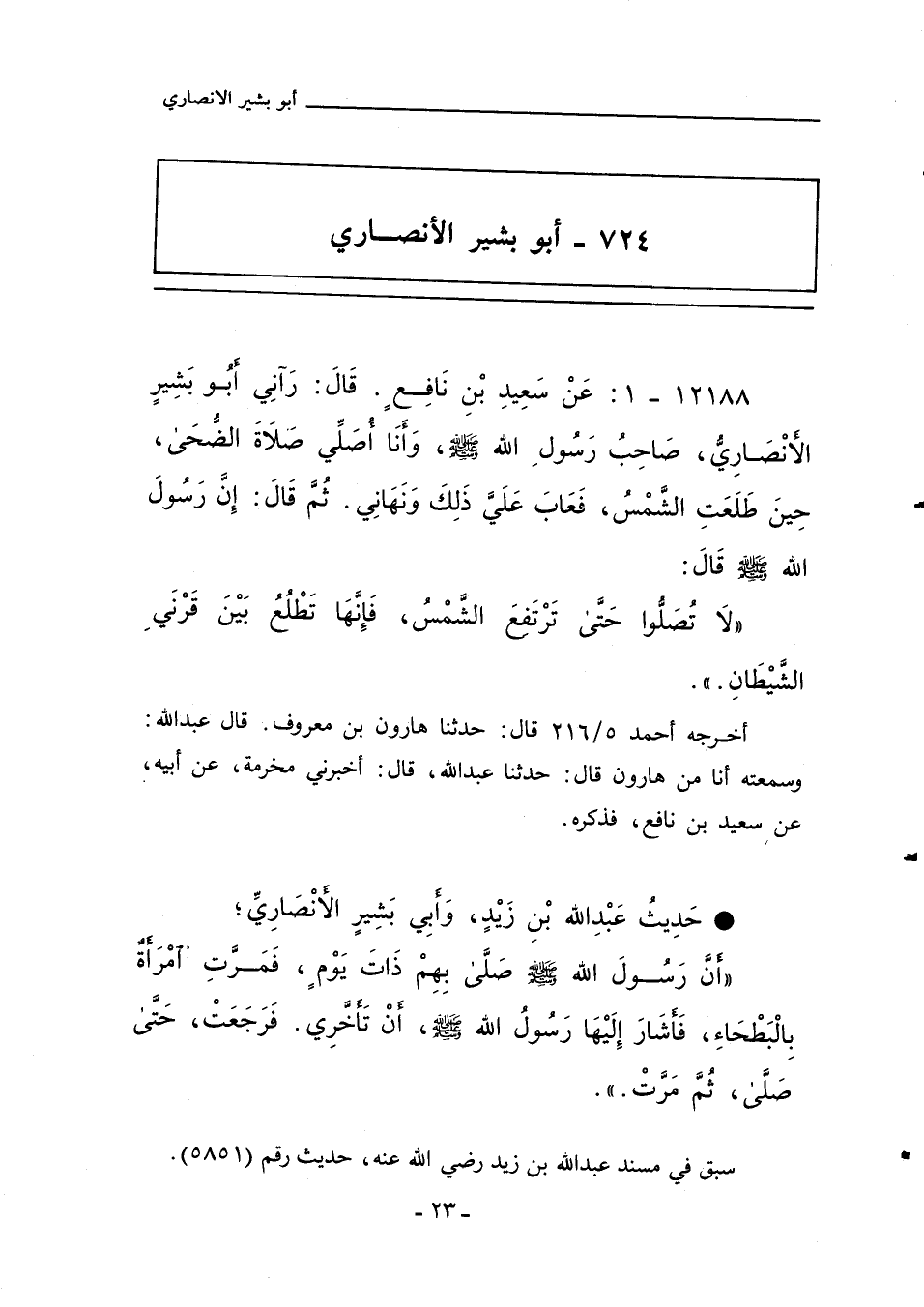 ١٢١٨٨ - عَنْ سَعِيدِ بْنِ نَافِعٍ، قَالَ: رَآنِي أَبُو بَشِيرٍ الأَنْصَارِيُّ، صَاحِبُ رَسُولِ اللهِ صلى الله عليه وسلم، وَأَنَا أُصَلِّي صَلَاةَ الضُّحَى، حِينَ طَلَعَتِ الشَّمْسُ، فَعَابَ عَلَيَّ ذَلِكَ وَنَهَانِي، ثُمَّ قَالَ: إِنَّ رَسُولَ اللهِ صلى الله عليه وسلم قَالَ: