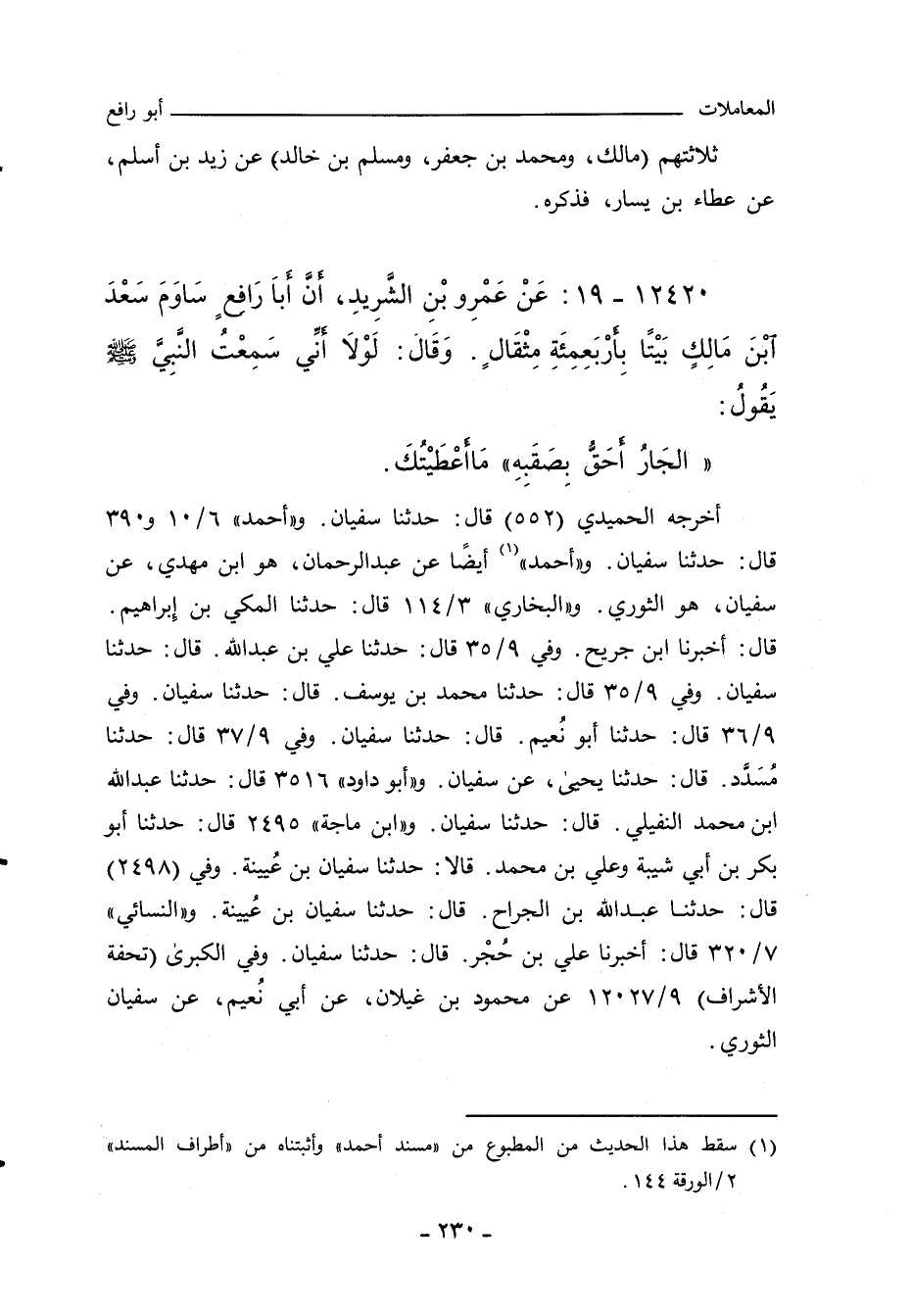 ١٢٤٢٠ - عَنْ عَمْرِو بْنِ الشَّرِيدِ، أَنَّ أَبَا رَافِعٍ سَاوَمَ سَعْدَ بْنَ مَالِكٍ بَيْتًا بِأَرْبَعِمِئَةِ مِثْقَالٍ، وَقَالَ: لَوْلَا أَنِّي سَمِعْتُ النَّبِيَّ صلى الله عليه وسلم يَقُولُ: