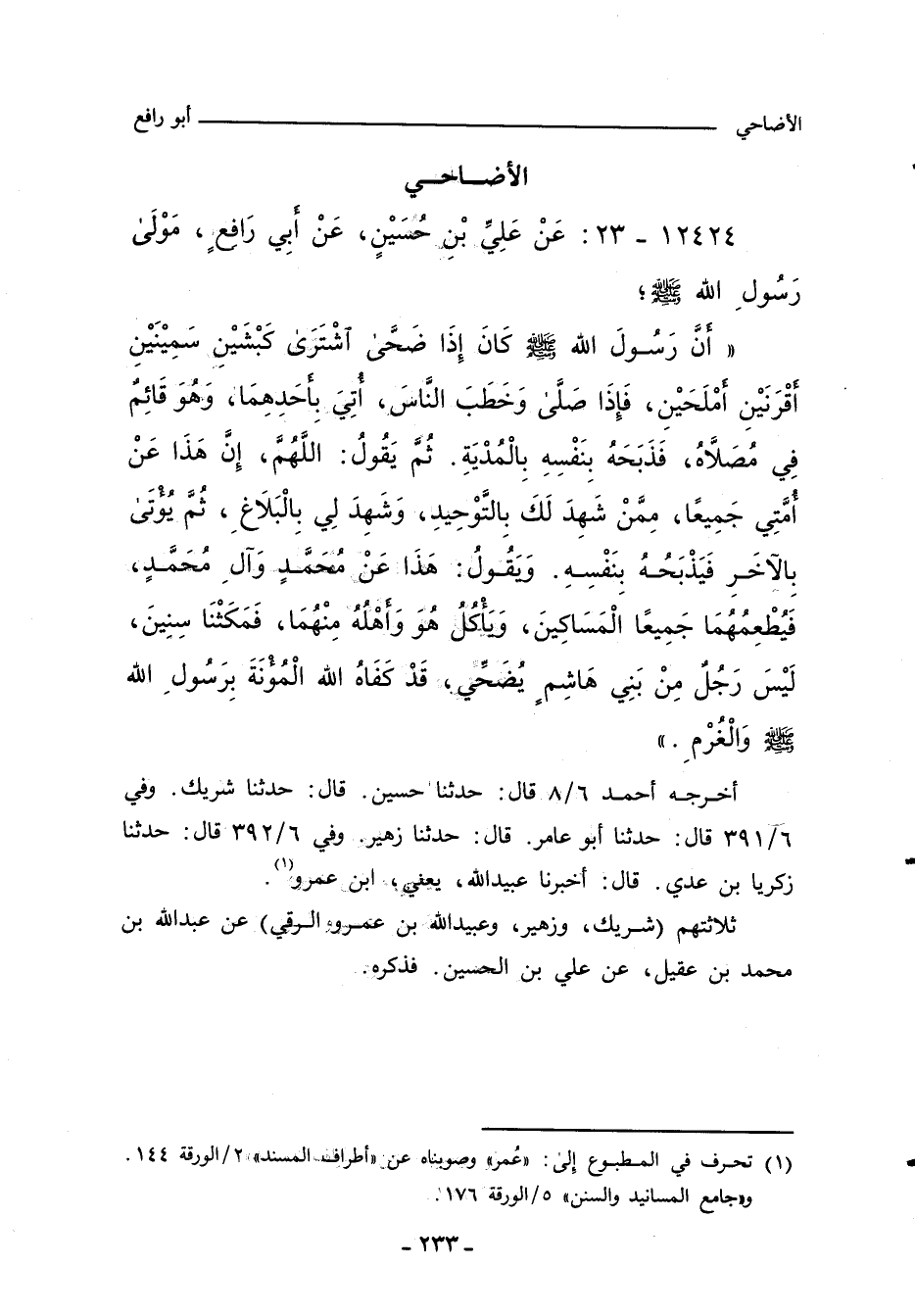 أَنَّ رَسُولَ اللهِ صلى الله عليه وسلم كَانَ إِذَا ضَحَّى اشْتَرَى كَبْشَيْنِ سَمِينَيْنِ أَقْرَنَيْنِ أَمْلَحَيْنِ، فَإِذَا صَلَّى وَخَطَبَ النَّاسَ، أُتِيَ بِأَحَدِهِمَا وَهُوَ قَائِمٌ فِي مُصَلَاّهُ، فَذَبَحَهُ بِنَفْسِهِ بِالْمُدْيَةِ، ثُمَّ يَقُولُ: اللَّهُمَّ هَذَا عَنْ أُمَّتِي جَمِيعًا، مِمَّنْ شَهِدَ لَكَ بِالتَّوْحِيدِ، وَشَهِدَ لِي بِالْبَلَاغِ، ثُمَّ يُؤْتَى بِالآخَرِ فَيَذْبَحُهُ بِنَفْسِهِ، وَيَقُولُ: هَذَا عَنْ مُحَمَّدٍ وَآلِ مُحَمَّدٍ، فَيُطْعِمُهُمَا جَمِيعًا الْمَسَاكِينَ، وَيَأْكُلُ هُوَ وَأَهْلُهُ مِنْهُمَا، فَمَكَثْنَا سِنِينَ، لَيْسَ رَجُلٌ مِنْ بَنِي هَاشِمٍ يُضَحِّي، قَدْ كَفَاهُ اللهُ الْمُؤْنَةَ بِرَسُولِ اللهِ صلى الله عليه وسلم وَالْغُرْمَ.