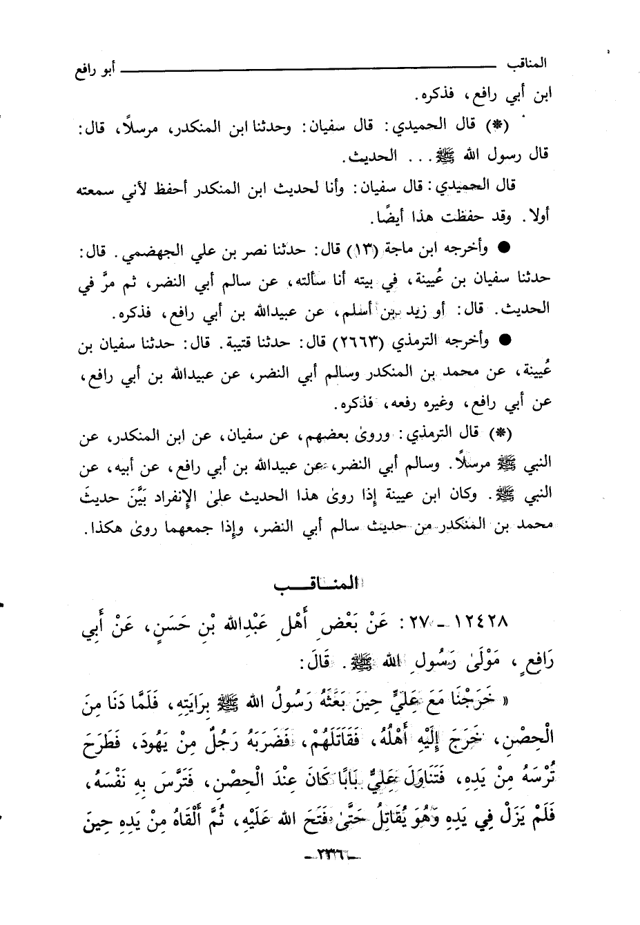 - وأخرجه الترمذي (٢٦٦٣) قال: حدَّثنا قتيبة، حدَّثنا سفيان بن عُيينة، عن محمد بن المنكدر، وسالم أبي النضر، عن عبيد الله بن أبي رافع، عن أبي رافع، وغيره رفعه، قَالَ: