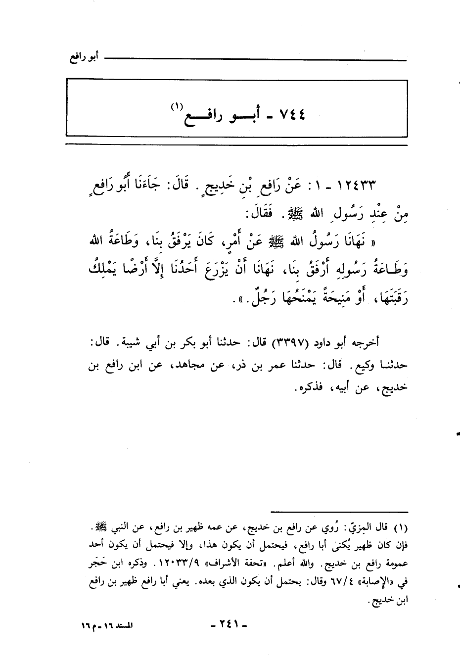 ١٢٤٣٣ - عَنْ رَافِعِ بْنِ خَدِيجٍ، قَالَ: جَاءَنَا أَبُو رَافِعٍ مِنْ عِنْدِ رَسُولِ اللهِ صلى الله عليه وسلم، فَقَالَ: