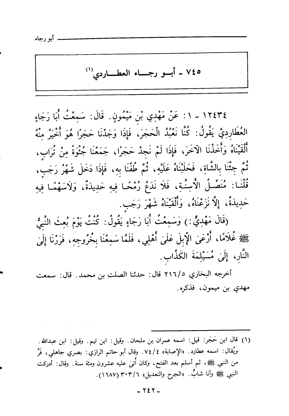 ١٢٤٣٤ - عَنْ مَهْدِىِّ بْنِ مَيْمُونٍ، قَالَ: سَمِعْتُ أَبَا رَجَاءٍ الْعُطَارِدِىَّ يَقُولُ: كُنَّا نَعْبُدُ الْحَجَرَ، فَإِذَا وَجَدْنَا حَجَرًا هُوَ أَخْيَرُ مِنْهُ أَلْقَيْنَاهُ وَأَخَذْنَا الآخَرَ، فَإِذَا لَمْ نَجِدْ حَجَرًا جَمَعْنَا جُثْوَةً مِنْ تُرَابٍ، ثُمَّ جِئْنَا بِالشَّاةِ فَحَلَبْنَاهُ عَلَيْهِ، ثُمَّ طُفْنَا بِهِ، فَإِذَا دَخَلَ شَهْرُ رَجَبٍ، قُلْنَا: مُنَصِّلُ الأَسِنَّةِ، فَلَا نَدَعُ رُمْحًا فِيهِ حَدِيدَةٌ وَلَا سَهْمًا فِيهِ حَدِيدَةٌ، إِلَاّ نَزَعْنَاهُ، وَأَلْقَيْنَاهُ شَهْرَ رَجَبٍ.