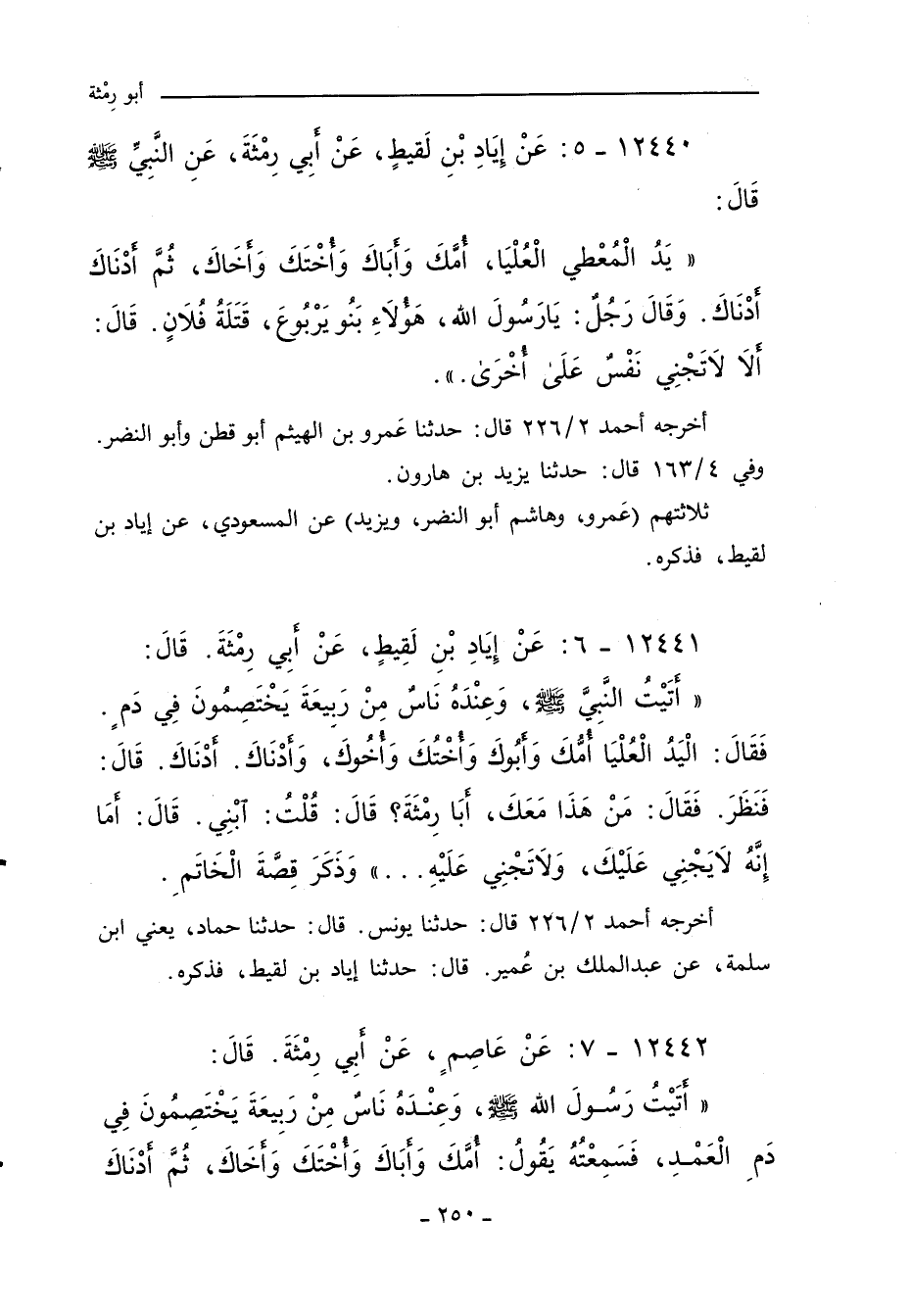 أَتَيْتُ النَّبِىَّ صلى الله عليه وسلم وَعِنْدَهُ نَاسٌ مِنْ رَبِيعَةَ يَخْتَصِمُونَ فِى دَمٍ فَقَالَ الْيَدُ الْعُلْيَا أُمَّكَ وَأَبَاكَ وَأُخْتَكَ وَأَخَاكَ وَأَدْنَاكَ أَدْنَاكَ قَالَ فَنَظَرَ فَقَالَ مَنْ هَذَا مَعَكَ أَبَا رِمْثَةَ قَالَ قُلْتُ ابْنِى قَالَ أَمَا إِنَّهُ لَا يَجْنِى عَلَيْكَ وَلَا تَجْنِى عَلَيْهِ. وَذَكَرَ قِصَّةَ الْخَاتَمِ.