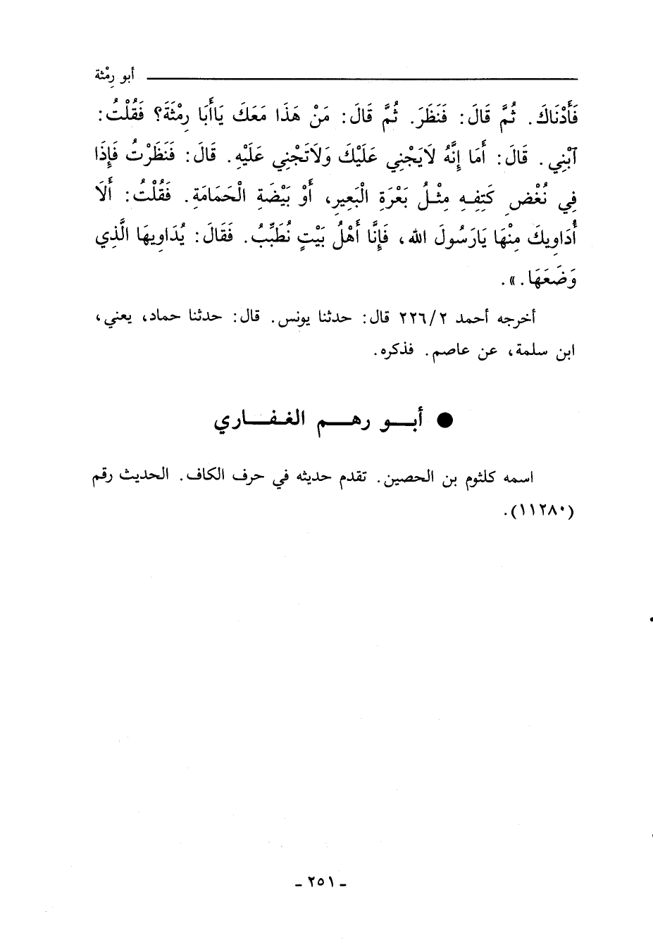 اسمه كلثوم بن الحصين، تقدم حديثه في حرف الكاف، الحديث رقم (١١٢٨٠".