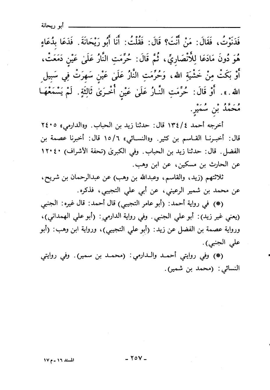 فَدَنَوْتُ، فَقَالَ: مَنْ أَنْتَ؟ قَالَ: فَقُلْتُ: أَنَا أَبُو رَيْحَانَةَ، فَدَعَا بِدُعَاءٍ هُوَ دُونَ مَا دَعَا لِلأَنْصَارِيِّ، ثُمَّ قَالَ: حُرِّمَتِ النَّارُ عَلَى عَيْنٍ دَمَعَتْ، أَوْ بَكَتْ مِنْ خَشْيَةِ اللهِ، وَحُرِّمَتِ النَّارُ عَلَى عَيْنٍ سَهِرَتْ فِي سَبِيلِ اللهِ.