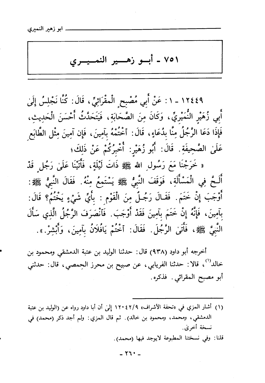 ١٢٤٤٩ - عَنْ أَبِيِ مُصْبِحٍ الْمَقْرَائِيِّ، قَالَ: كُنَّا نَجْلِسُ إِلَى أَبِي زُهَيْرٍ النُّمَيْرِيِّ، وَكَانَ مِنَ الصَّحَابَةِ، فَيَتَحَدَّثُ أَحْسَنَ الْحَدِيثِ، فَإِذَا دَعَا الرَّجُلُ مِنَّا بِدُعَاءٍ، قَالَ: اخْتِمْهُ بِآمِينَ، فَإِنَّ آمِينَ مِثْلُ الطَّابَعِ عَلَى الصَّحِيفَةِ، قَالَ أَبُو زُهَيْرٍ: أُخْبِرُكُمْ عَنْ ذَلِكَ؛