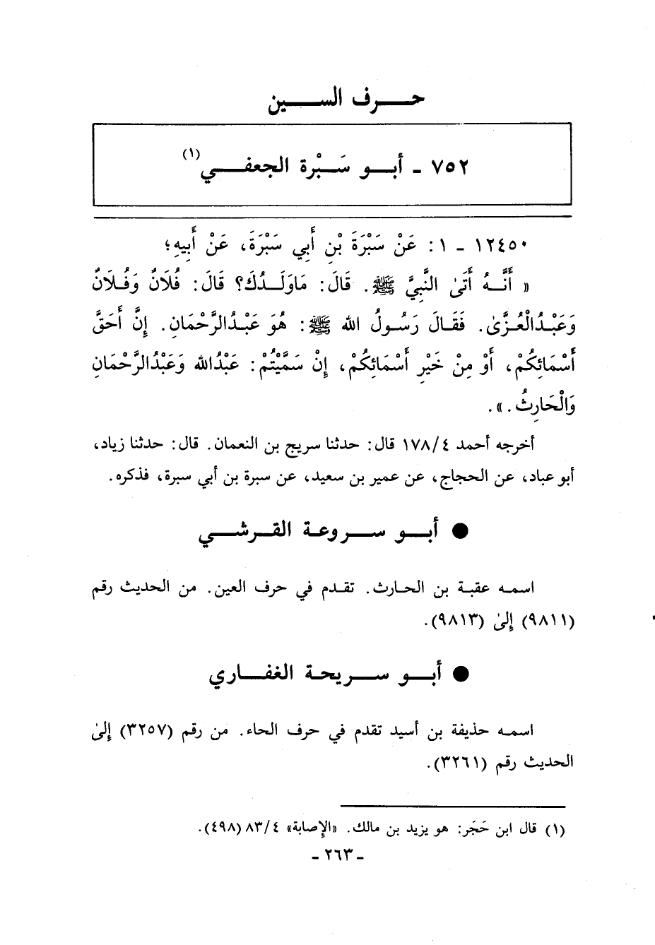 أَنَّهُ أَتَى النَّبِيَّ صلى الله عليه وسلم، قَالَ: مَا وَلَدُكَ؟ قَالَ: فُلَانٌ وَفُلَانٌ وَعَبْدُ الْعُزَّى، فَقَالَ رَسُولُ اللهِ صلى الله عليه وسلم: هُوَ عَبْدُ الرَّحْمَانِ، إِنَّ مِنْ أَحَقِّ أَسْمَائِكُمْ، أَوْ مِنْ خَيْرِ أَسْمَائِكُمْ، إِنْ سَمَّيْتُمْ عَبْدَ اللهِ، وَعَبْدَ الرَّحْمَانِ، وَالْحَارِثَ.