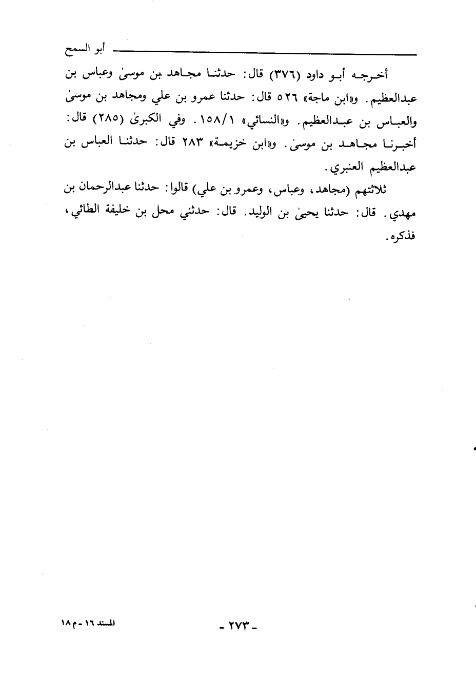 أخرجه أبو داود (٣٧٦) قال: حدَّثنا مجاهد بن موسى، وعباس بن عبد العظيم، المعنى. و"ابن ماجة" ٥٢٦ قال: حدَّثنا عمرو بن علي، ومجاهد بن موسى، والعباس بن عبد العظيم. و"النَّسائي" ١/ ١٥٨، وفي "الكبرى" ٢٨٩ قال: أَخْبَرنا مجاهد بن موسى. و"ابن خزيمة" ٢٨٣ قال: حدَّثنا العباس بن عبد العظيم العنبري.