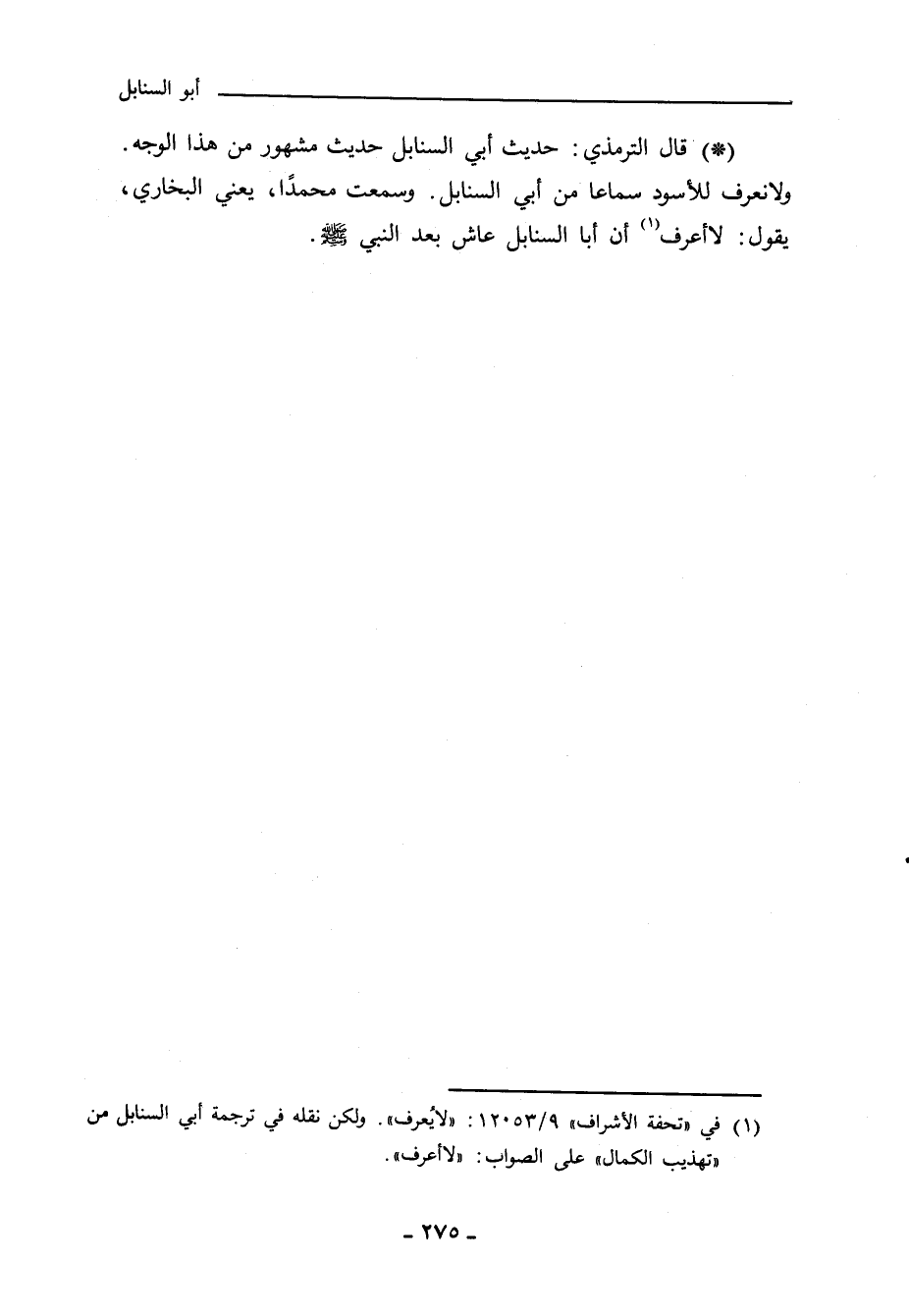 - قال أبو عِيسَى الترمذيُّ: حديث أبي السنابل حديث مشهور من هذا الوجه، ولا نعرف للأسود سماعًا من أبي السنابل، وسمعت محمدًا، يعني البخاري، يقول: لا أعرف أن أبا السنابل عاش بعد النبي صلى الله عليه وسلم.