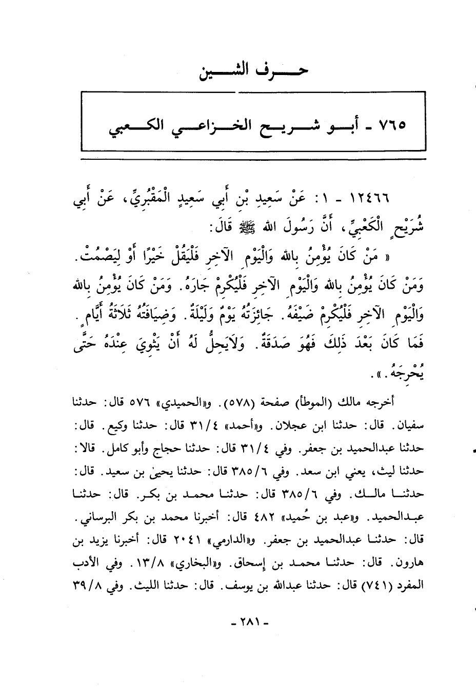 ١٢٤٦٦ - عَنْ سَعِيدِ بْنِ أَبِي سَعِيدٍ الْمَقْبُرِيِّ، عَنْ أَبِي شُرَيْحٍ الْكَعْبِيِّ، أَنَّ رَسُولَ اللهِ صلى الله عليه وسلم قَالَ:
