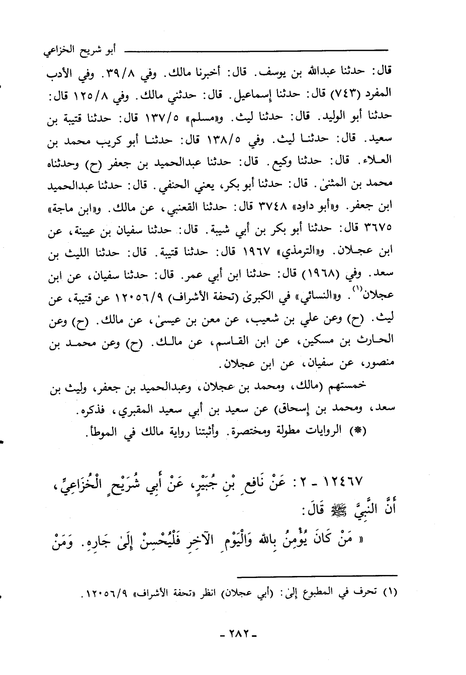 ١٢٤٦٧ - عَنْ نَافِعِ بْنِ جُبَيْرٍ، عَنْ أَبِي شُرَيْحٍ الْخُزَاعِيِّ، أَنَّ النَّبِيَّ صلى الله عليه وسلم قَالَ: