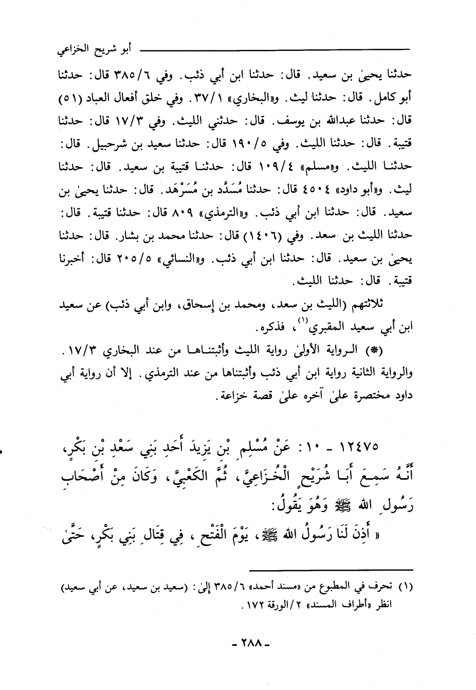 ١٢٤٧٥ - عَنْ مُسْلِمِ بْنِ يَزِيدَ، أَحَدِ بَنِي سَعْدِ بْنِ بَكْرٍ، أَنَّهُ سَمِعَ أَبَا شُرَيْحٍ الْخُزَاعِيَّ، ثُمَّ الْكَعْبِيَّ، وَكَانَ مِنْ أَصْحَابِ رَسُولِ اللهِ صلى الله عليه وسلم وَهُوَ يَقُولُ: