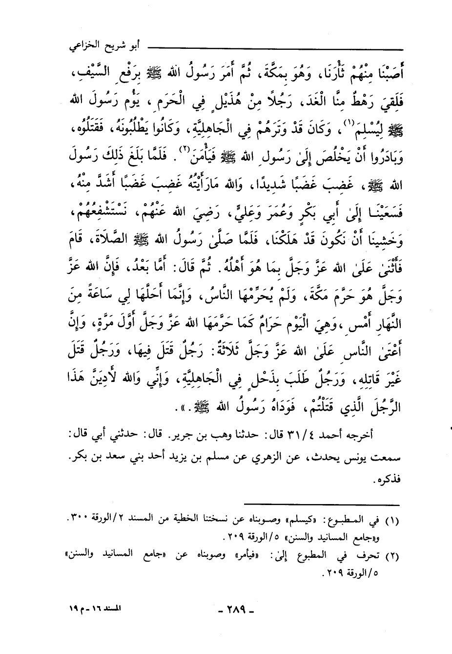أَصَبْنَا مِنْهُمْ ثَأْرَنَا، وَهُوَ بِمَكَّةَ، ثُمَّ أَمَرَ رَسُولُ اللهِ صلى الله عليه وسلم بِرَفْعِ السَّيْفِ، فَلَقِيَ رَهْطٌ مِنَّا الْغَدَ، رَجُلاً مِنْ هُذَيْلٍ فِي الْحَرَمِ، يَؤُمُّ رَسُولَ اللهِ صلى الله عليه وسلم لِيُسْلِمَ، وَكَانَ قَدْ وَتَرَهُمْ فِي الْجَاهِلِيَّةِ، وَكَانُوا يَطْلُبُونَهُ، فَقَتَلُوهُ، وَبَادَرُوا أَنْ يَخْلُصَ إِلَى رَسُولِ اللهِ صلى الله عليه وسلم فَيَأْمَنَ، فَلَمَّا بَلَغَ ذَلِكَ رَسُولَ اللهِ صلى الله عليه وسلم، غَضِبَ غَضَبًا شَدِيدًا، وَاللهِ مَا رَأَيْتُهُ غَضِبَ غَضَبًا أَشَدَّ مِنْهُ، فَسَعَيْنَا إِلَى أَبِي بَكْرٍ وَعُمَرَ وَعَلِيٍّ، رَضِيَ اللهُ عَنْهُمْ، نَسْتَشْفِعُهُمْ، وَخَشِينَا أَنْ نَكُونَ قَدْ هَلَكْنَا، فَلَمَّا صَلَّى رَسُولُ اللهِ صلى الله عليه وسلم الصَّلَاةَ، قَامَ فَأَثْنَى عَلَى اللهِ، عَزَّ وَجَلَّ، بِمَا هُوَ أَهْلُهُ، ثُمَّ قَالَ: أَمَّا بَعْدُ، فَإِنَّ اللهَ، عَزَّ وَجَلَّ، هُوَ حَرَّمَ مَكَّةَ، وَلَمْ يُحَرِّمْهَا النَّاسُ، وَإِنَّمَا أَحَلَّهَا لِي سَاعَةً مِنَ النَّهَارِ، أَمْسِ وَهِيَ الْيَوْمَ حَرَامٌ، كَمَا حَرَّمَهَا اللهُ، عَزَّ وَجَلَّ، أَوَّلَ مَرَّةٍ، وَإِنَّ أَعْتَى النَّاسِ عَلَى اللهِ، عَزَّ وَجَلَّ، ثَلَاثَةٌ: رَجُلٌ قَتَلَ فِيهَا، وَرَجُلٌ قَتَلَ غَيْرَ قَاتِلِهِ، وَرَجُلٌ طَلَبَ بِذَحْلٍ فِي الْجَاهِلِيَّةِ، وَإِنِّي وَاللهِ لأَدِيَنَّ هَذَا الرَّجُلَ