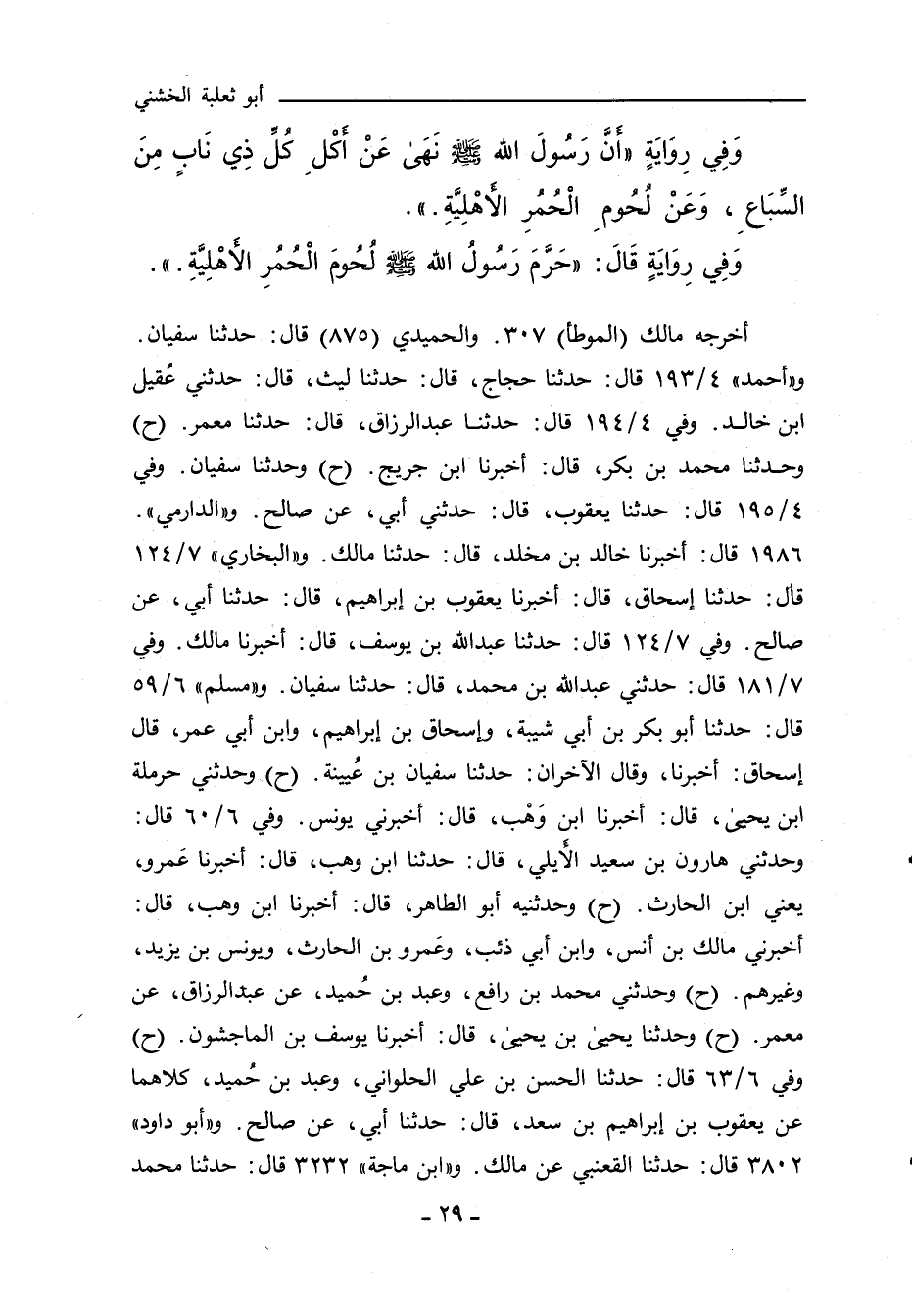 - وفي رواية: أَنَّ رَسُولَ اللهِ صلى الله عليه وسلم نَهَى عَنْ أَكْلِ كُلِّ ذِي نَابٍ مِنَ السِّبَاعِ، وَعَنْ لُحُومِ الْحُمُرِ الأَهْلِيَّةِ.