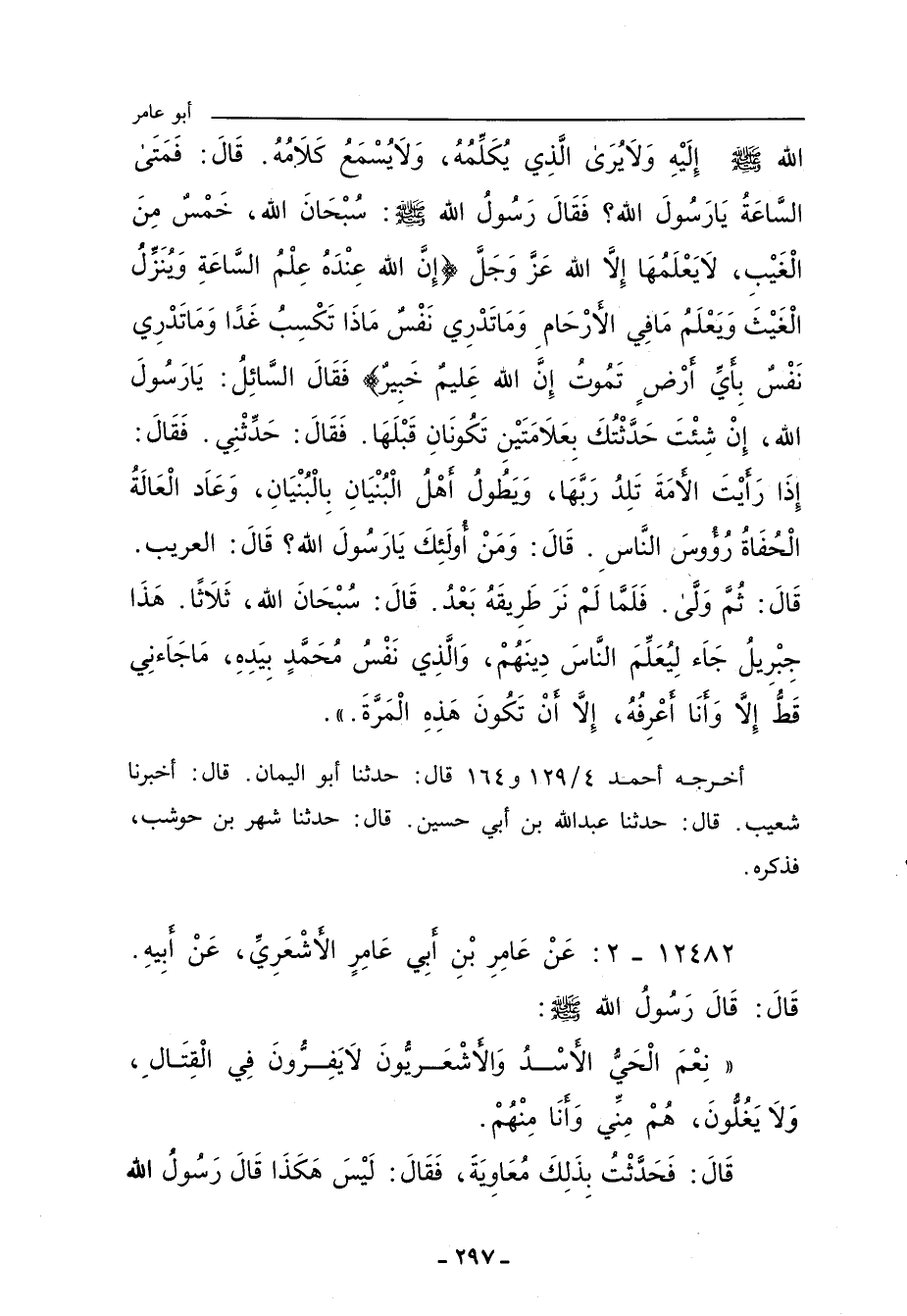 وَجَلَّ: "إِنَّ اللهَ عِنْدَهُ عِلْمُ السَّاعَةِ وَيُنَزِّلُ الْغَيْثَ وَيَعْلَمُ مَا فِي الأَرْحَامِ وَمَا تَدْرِي نَفْسٌ مَاذَا تَكْسِبُ غَدًا وَمَا تَدْرِي نَفْسٌ بِأَيِّ أَرْضٍ تَمُوتُ إِنَّ اللهَ عَلِيمٌ خَبِيرٌ) فَقَالَ السَّائِلُ: يَا رَسُولَ اللهِ، إِنْ شِئْتَ حَدَّثْتُكَ بِعَلَامَتَيْنِ تَكُونَانِ قَبْلَهَا، فَقَالَ: حَدِّثْنِي، فَقَالَ: إِذَا رَأَيْتَ الأَمَةَ تَلِدُ رَبَّهَا، وَيَطُولُ أَهْلُ الْبُنْيَانِ بِالْبُنْيَانِ، وَعَادَ الْعَالَةُ الْحُفَاةُ رُؤُوسَ النَّاسِ، قَالَ: وَمَنْ أُولَئِكَ يَا رَسُولَ اللهِ؟ قَالَ: الْعَرِيبُ، قَالَ: ثُمَّ وَلَّى، فَلَمَّا لَمْ نَرَ طَرِيقَهُ بَعْدُ، قَالَ: سُبْحَانَ اللهِ، ثَلَاثًا، هَذَا جِبْرِيلُ جَاءَ لِيُعَلِّمَ النَّاسَ دِينَهُمْ، وَالَّذِي نَفْسُ مُحَمَّدٍ بِيَدِهِ، مَا جَاءَنِي قَطُّ إِلَاّ وَأَنَا أَعْرِفُهُ، إِلَاّ أَنْ تَكُونَ هَذِهِ الْمَرَّةُ.