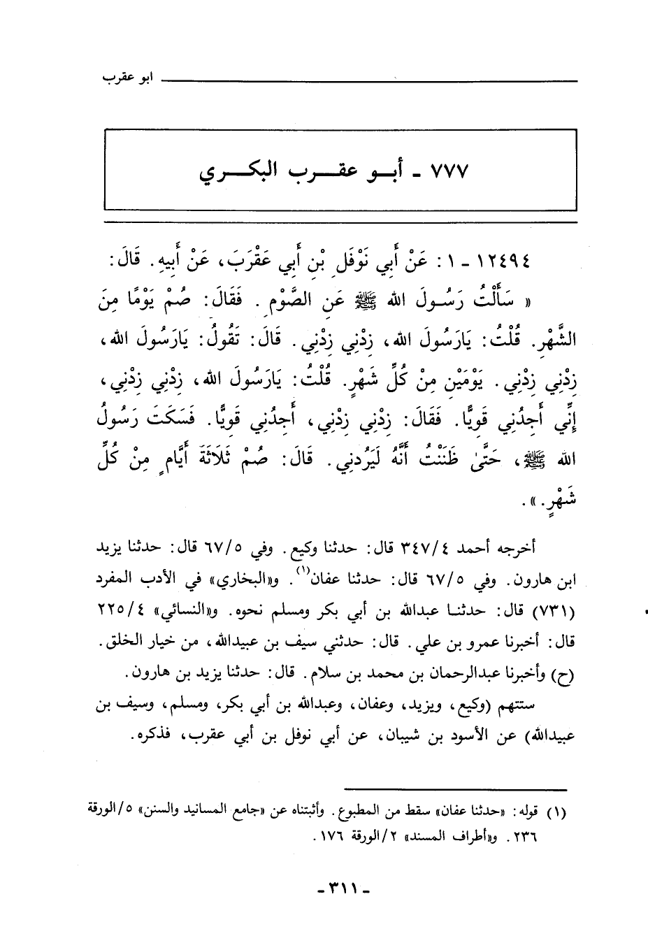 ستتهم (وكيع، ويزيد، وعفان، وعبد الله بن أبي بكر، ومسلم بن إبراهيم، وسيف بن عبيد الله) عن الأسود بن شيبان، عن أبي نوفل بن أبي عقرب، فذكره.