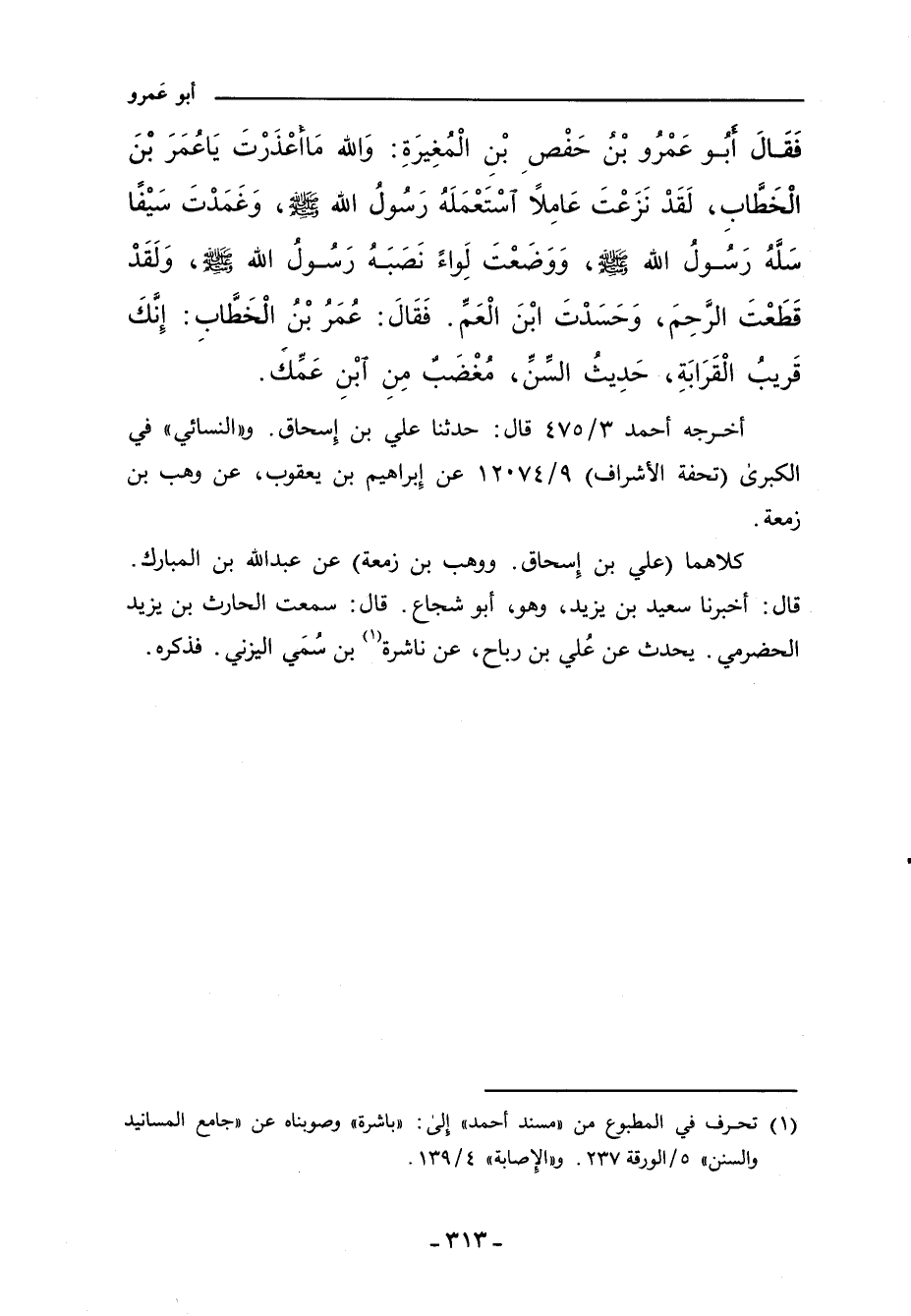 فَقَالَ أَبُو عَمْرِو بْنُ حَفْصِ بْنِ الْمُغِيرَةِ: وَاللهِ مَا أَعْذَرْتَ يَا عُمَرُ بْنَ الْخَطَّابِ، لَقَدْ نَزَعْتَ عَامِلاً اسْتَعْمَلَهُ رَسُولُ اللهِ صلى الله عليه وسلم