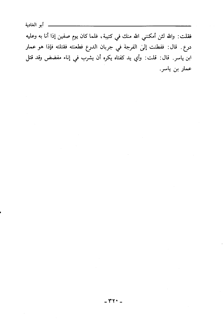 فَقُلْتُ: وَاللهِ لَئِنْ أَمْكَنَنِي اللهُ مِنْكَ فِي كَتِيبَةٍ، فَلَمَّا كَانَ يَوْمُ صِفِّينَ، إِذَا أَنَا بِهِ وَعَلَيْهِ دِرْعٌ، قَالَ: فَفَطِنْتُ إِلَى الْفُرْجَةِ فِي جُرُبَّانِ الدِّرْعِ، فَطَعَنْتُهُ فَقَتَلْتُهُ، فَإِذَا هُوَ عَمَّارُ بْنُ يَاسِرٍ، قَالَ: قُلْتُ: وَأَيَّ يَدٍ كَفَتَاهُ يَكْرَهُ أَنْ يَشْرَبَ فِي إِنَاءٍ مُفَضَّضٍ، وَقَدْ قَتَلَ عَمَّارَ بْنَ يَاسِرٍ.