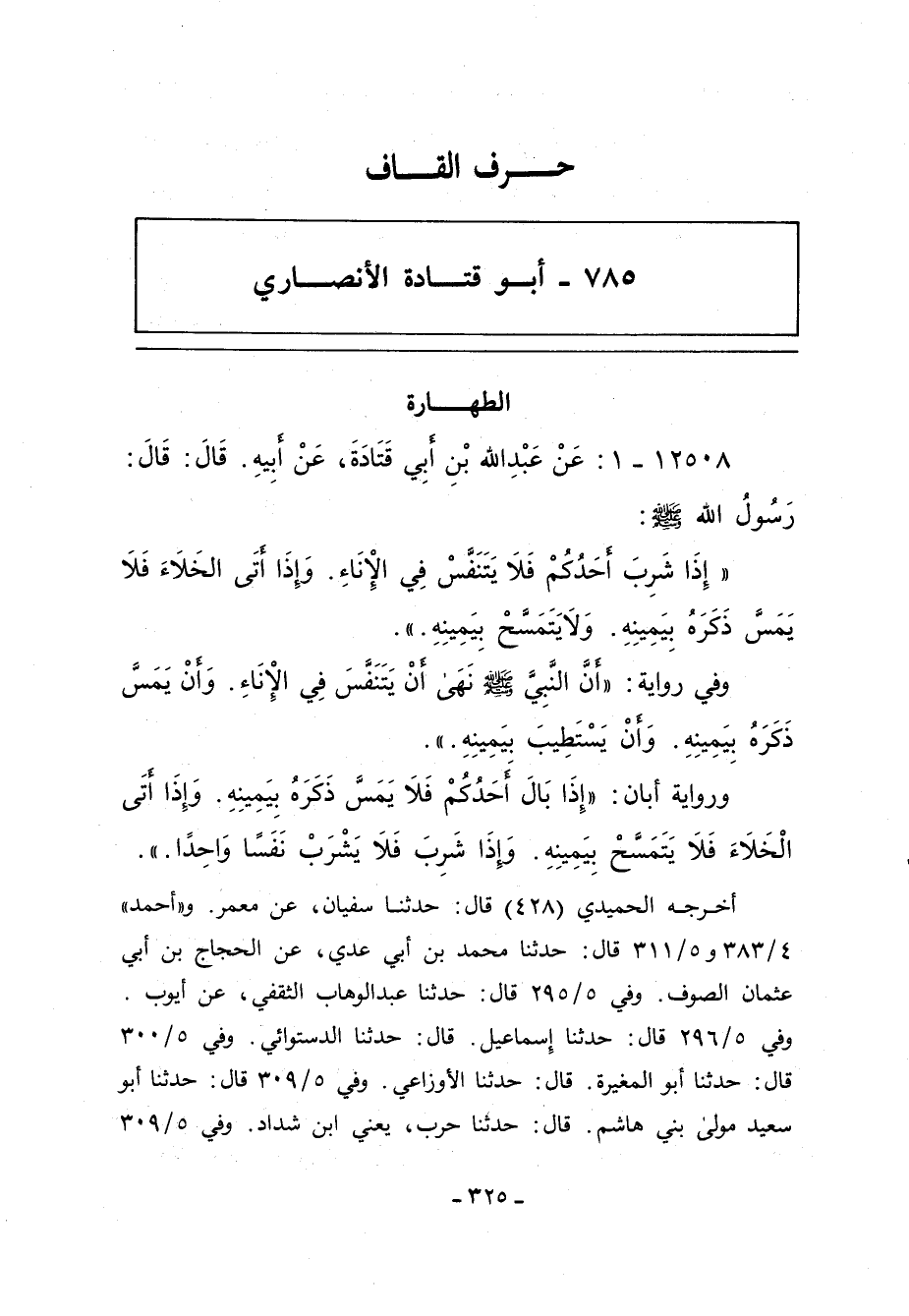 - وفي رواية: " لَا يُمْسِكَنَّ أَحَدُكُمْ ذَكَرَهُ بِيَمِينِهِ وَهُوَ يَبُولُ، وَلَا يَتَمَسَّحْ مِنَ الْخَلَاءِ بِيَمِينِهِ، وَلَا يَتَنَفَّسْ فِي الإِنَاءِ. م (٥٣٤)