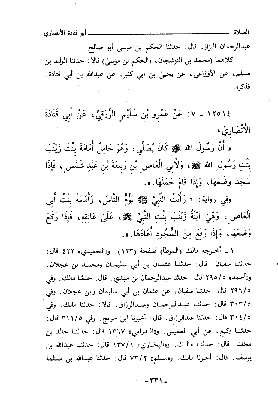 - وفي رواية: " رَأَيْتُ رَسُولَ اللهِ صلى الله عليه وسلم يُصَلِّي لِلنَّاسِ، وَأُمَامَةُ بِنْتُ أَبِي الْعَاصِ عَلَى عُنُقِهِ، فَإِذَا سَجَدَ وَضَعَهَا. م (١١٥١)