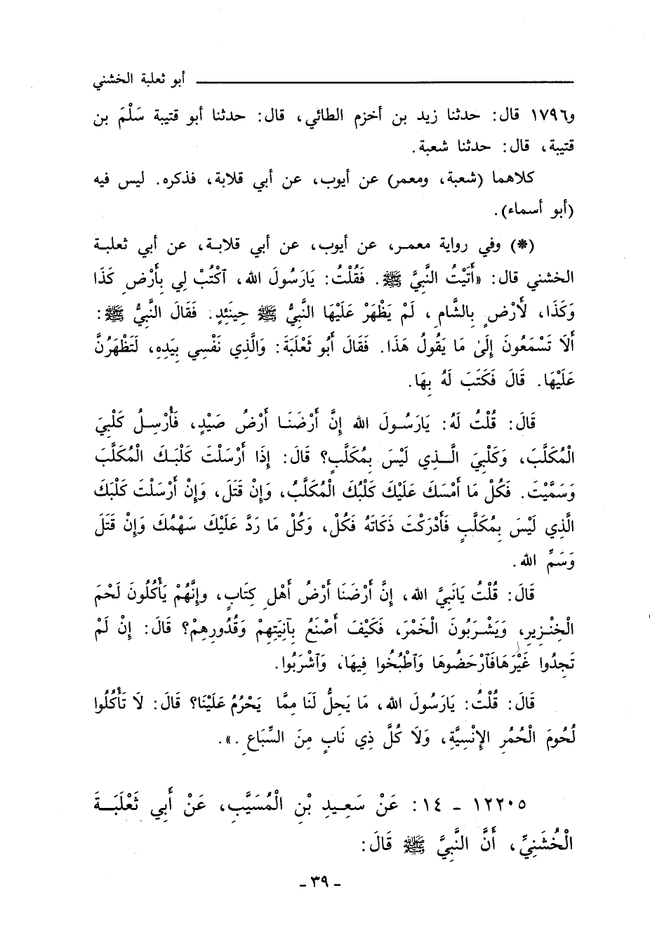 أَتَيْتُ النَّبِيَّ صلى الله عليه وسلم، فَقُلْتُ: يَا رَسُولَ اللهِ، اكْتُبْ لِي بِأَرْضِ كَذَا وَكَذَا، لأَرْضٍ بِالشَّامِ، لَمْ يَظْهَرْ عَلَيْهَا النَّبِيُّ صلى الله عليه وسلم حِينَئِذٍ، فَقَالَ النَّبِيُّ صلى الله عليه وسلم: أَلَا تَسْمَعُونَ إِلَى مَا يَقُولُ هَذَا؟ فَقَالَ أَبُو ثَعْلَبَةَ: وَالَّذِي نَفْسِي بِيَدِهِ لَتَظْهَرُنَّ عَلَيْهَا، قَالَ: فَكَتَبَ لَهُ بِهَا، قَالَ: قُلْتُ: يَا رَسُولَ اللهِ، إِنَّ أَرْضَنَا أَرْضُ صَيْدٍ، فَأُرْسِلُ كَلْبِيَ الْمُكَلَّبَ، وَكَلْبِيَ الَّذِي لَيْسَ بِمُكَلَّبٍ، قَالَ: إِذَا أَرْسَلْتَ كَلْبَكَ الْمُكَلَّبَ وَسَمَّيْتَ فَكُلْ مَا أَمْسَكَ عَلَيْكَ كَلْبُكَ الْمُكَلَّبُ وَإِنْ قَتَلَ، وَإِنْ أَرْسَلْتَ كَلْبَكَ الَّذِي لَيْسَ بِمُكَلَّبٍ، فَأَدْرَكْتَ ذَكَاتَهُ فَكُلْ، وَكُلْ مَا رَدَّ عَلَيْكَ سَهْمُكَ وَإِنْ قَتَلَ وَسَمِّ اللهَ، قَالَ: قُلْتُ: يَا نَبِيَّ اللهِ، إِنَّ أَرْضَنَا أَرْضُ أَهْلِ كِتَابٍ، وَإِنَّهُمْ يَأْكُلُونَ لَحْمَ الْخِنْزِيرِ، وَيَشْرَبُونَ الْخَمْرَ، فَكَيْفَ أَصْنَعُ بِآنِيَتِهِمْ وقُدُورِهِمْ؟ قَالَ: إِنْ لَمْ تَجِدُوا غَيْرَهَا فَارْحَضُوهَا، وَاطْبُخُوا فِيهَا، وَاشْرَبُوا، قَالَ: قُلْتُ: يَا رَسُولَ اللهِ، مَا يَحِلُّ لَنَا مِمَّا يُحَرَّمُ عَلَيْنَا؟ قَالَ: لَا تَأْكُلُوا لُحُومَ الْحُمُرِ الإِنْسِيَّةِ، وَلَا كُلَّ ذِي نَابٍ مِنَ السِّبَاعِ.