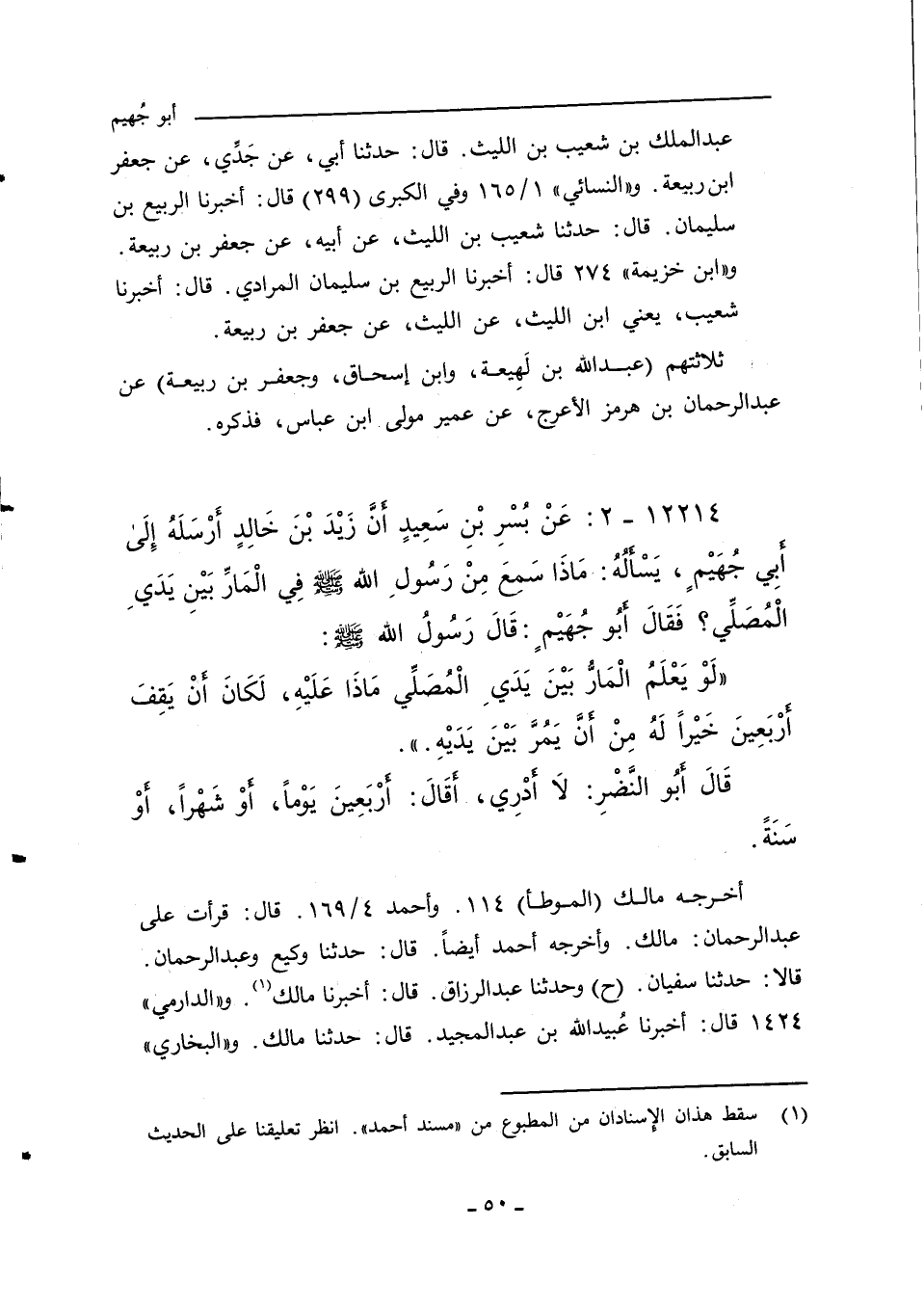 ١٢٢١٤ - عَنْ بُسْرِ بْنِ سَعِيدٍ، أَنَّ زَيْدَ بْنَ خَالِدٍ أَرْسَلَهُ إِلَى أَبِي جُهَيْمٍ يَسْأَلُهُ مَاذَا سَمِعَ مِنْ رَسُولِ اللهِ صلى الله عليه وسلم فِي الْمَارِّ بَيْنَ يَدَيِ الْمُصَلِّي، فَقَالَ أَبُو جُهَيْمٍ: قَالَ رَسُولُ اللهِ صلى الله عليه وسلم: