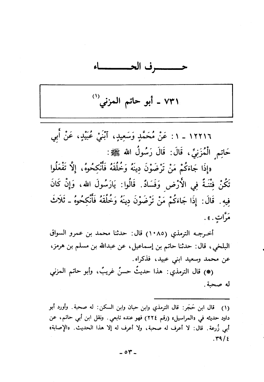 - قال أبو عِيسَى الترمذيُّ: هذا حديثٌ حسنٌ غريبٌ، وأبو حاتم المزني له صحبة، ولا نعرف له عن النَّبي صلى الله عليه وسلم غير هذا الحديث.