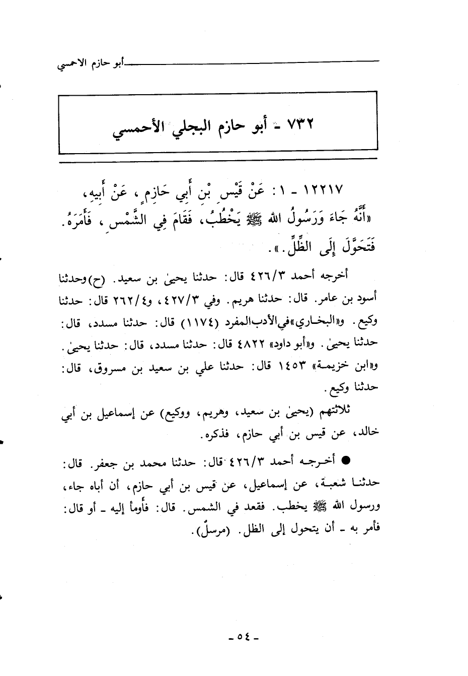 ثلاثتهم (عيسى بن يونس، وابن نمير، وشعبة) عن إسماعيل بن أبي خالد، عن قيس بن أبي حازم، أَنَّ أَبَاهُ جَاءَ وَرَسُولُ اللهِ صلى الله عليه وسلم يَخْطُبُ، فَقَعَدَ فِي الشَّمْسِ، قَالَ: فَأَوْمَأَ إِلَيْهِ، أَوْ قَالَ: فَأَمَرَ بِهِ أَنْ يَتَحَوَّلَ إِلَى الظِّلِّ.