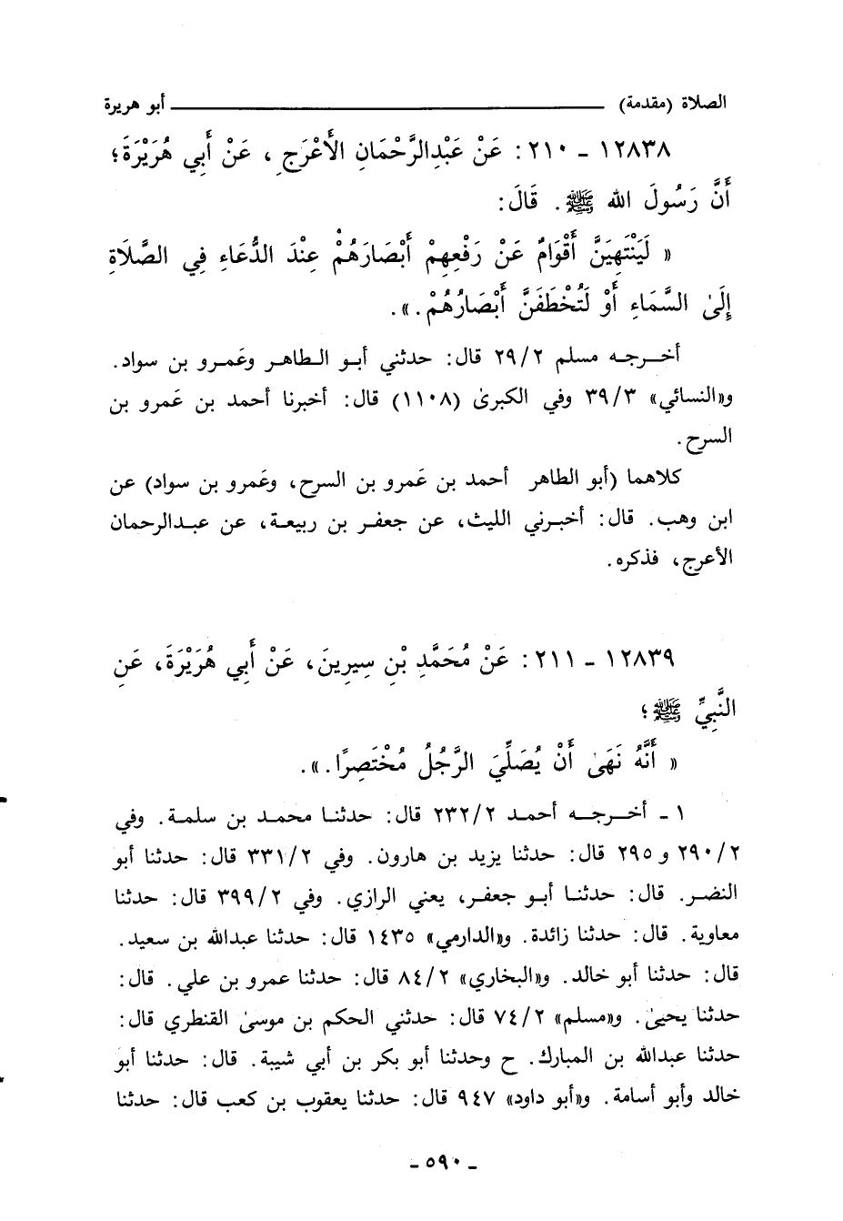 - وفي رواية: " (عَنْ أَبِي هُرَيْرَةَ، رَضِيَ اللَّهُ عَنْهُ، قَالَ: نُهِيَ أَن يُصَلِّيَ الرَّجُلُ مُخْتَصِرًا.) ".
