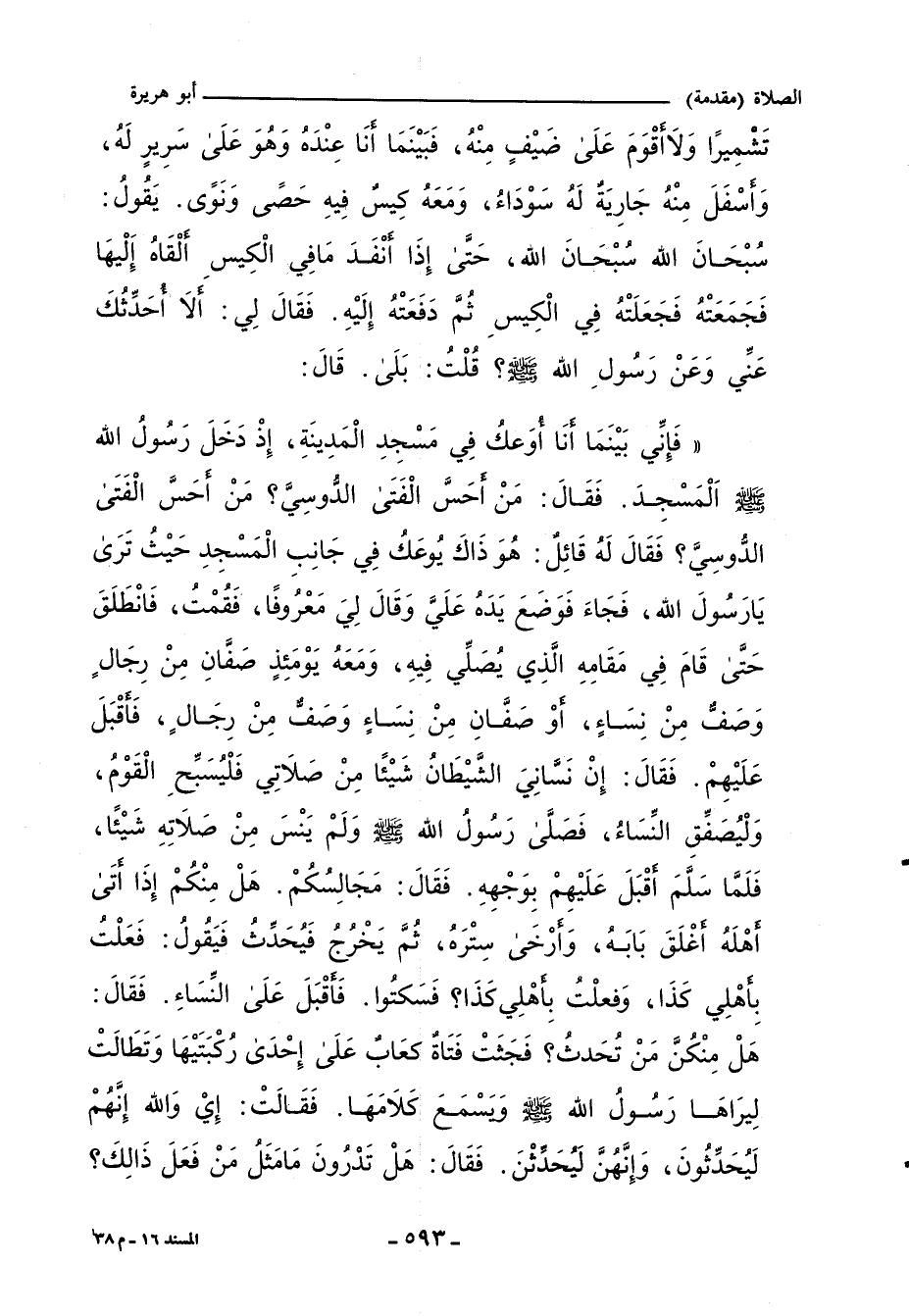 (فَإِنِّي بَيْنَمَا أَنَا أُوعَكُ فِي مَسْجِدِ الْمَدِينَةِ، إِذْ دَخَلَ رَسُولُ اللهِ صلى الله عليه وسلم الْمَسْجِدَ، فَقَالَ: مَنْ أَحَسَّ الْفَتَى الدَّوْسِيَّ؟ مَنْ أَحَسَّ الْفَتَى الدَّوْسِيَّ؟ فَقَالَ لَهُ قَائِلٌ: هُوَ ذَاكَ يُوعَكُ فِي جَانِبِ الْمَسْجِدِ حَيْثُ تَرَى يَا رَسُولَ اللهِ، فَجَاءَ فَوَضَعَ يَدَهُ عَلَيَّ وَقَالَ لِي مَعْرُوفًا، فَقُمْتُ، فَانْطَلَقَ حَتَّى قَامَ فِي مَقَامِهِ الَّذِي يُصَلِّي فِيهِ، وَمَعَهُ يَوْمَئِذٍ صَفَّانِ مِنْ رِجَالٍ، وَصَفٌّ مِنْ نِسَاءٍ، أَوْ صَفَّانِ مِنْ نِسَاءٍ، وَصَفٌّ مِنْ رِجَالٍ، فَأَقْبَلَ عَلَيْهِمْ، فَقَالَ: إِنْ نَسَّانِي الشَّيْطَانُ شَيْئًا مِنْ صَلَاتِي فَلْيُسَبِّحِ الْقَوْمُ، وَلْيُصَفِّقِ النِّسَاءُ، فَصَلَّى رَسُولُ اللهِ صلى الله عليه وسلم، وَلَمْ يَنْسَ مِنْ صَلَاتِهِ شَيْئًا، فَلَمَّا سَلَّمَ أَقْبَلَ عَلَيْهِمْ بِوَجْهِهِ، فَقَالَ: مَجَالِسَكُمْ، هَلْ مِنْكُمْ إِذَا أَتَى أَهْلَهُ أَغْلَقَ بَابَهُ، وَأَرْخَى سِتْرَهُ، ثُمَّ يَخْرُجُ فَيُحَدِّثُ فَيَقُولُ: فَعَلْتُ بِأَهْلِي كَذَا، وَفَعَلْتُ بِأَهْلِي كَذَا؟ فَسَكَتُوا، فَأَقْبَلَ عَلَى النِّسَاءِ، فَقَالَ: هَلْ مِنْكُنَّ مَنْ تُحَدِّثُ؟ فَجَثَتْ فَتَاةٌ كَعَابٌ عَلَى إِحْدَى رُكْبَتَيْهَا وَتَطَاوَلَتْ لِيَرَاهَا رَسُولُ اللهِ صلى الله عليه وسلم وَيَسْمَعَ كَلَامَهَا، فَقَالَتْ: إِي وَاللهِ إِنَّهُمْ لَيُحَدِّثُونَ، وَإِنَّهُنَّ لَيُحَدِّثْنَ، فَقَالَ: هَلْ تَدْرُونَ مَا مَثَلُ مَنْ فَعَلَ ذَلِكَ؟