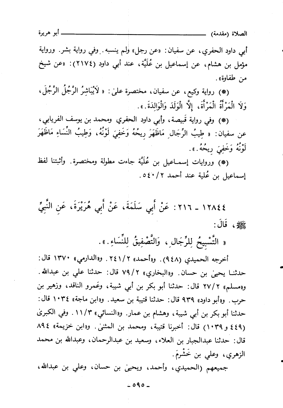 • ١ - أخرجه الحميدي (٩٤٨) قال: حدَّثنا سُفْيان. وابن أبي شَيْبَة ٢/ ٣٤١ (٧٢٥٢) و ١٤/ ٢١٢ (٣٦٢٦٢) قال: حدَّثنا سفيان بن عُييْنة. و ((أحمد))]] ٢/ ٢٤١ (٧٢٨٣) قال: حدَّثنا سُفْيان. و ((الدارِمِي))]] ١٣٦٣ قال: حدَّثنا يحيى بن حسان، حدَّثنا سُفْيان. و ((البُخاري))]] ١٢٠٣ قال: حدَّثنا علي بن عبد الله، حدَّثنا سُفْيان. و ((مسلم))]] ٨٨٤ قال: حدَّثنا أبو بكر بن أبي شيبة، وعَمرو الناقد، وزهير بن حرب، قالوا: حدَّثنا سفيان بن عُييْنة. و ((أبو داود))]] ٩٣٩ قال: حدَّثنا قتيبة بن سعيد، حدَّثنا سُفْيان. و ((ابن ماجة))]] ١٠٣٤ قال: حدَّثنا أبو بكر بن أبي شيبة، وهشام بن عمار، قالا: حدَّثنا سُفْيان بن عُيَيْنة. و ((النَّسائي))]] ٣/ ١١، وفي ((الكبرى))]] ٥٣٩ و ١١٣١ قال: أَخْبَرنا قتيبة، ومحمد بن المثنى، قالا: حدَّثنا سُفْيان. و ((ابن خزيمة))]] ٨٩٤ قال: حدَّثنا عبد الجبار بن العلاء، وسعيد بن عبد الرحمن، وعبد الله بن محمد الزهري، وعلي بن خَشْرمَ، قال علي: أخبرني ابن عُييْنة، وقال الآخرون: حدثنا سفيان. و ((أبو يَعْلَى))]] ٢٢٦٣ قال: أَخْبَرنا ابن قتيبة، حدثنا ابن أبي السري، حدثنا عبد الرزاق، أَخْبَرنا معمر.