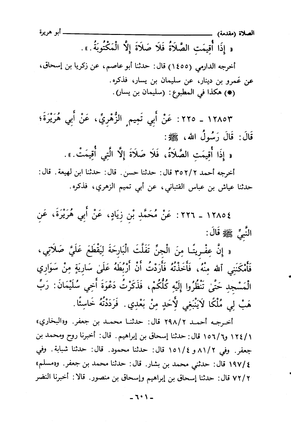 - وفي رواية: " (عَنِ النَّبِيِّ صلى الله عليه وسلم، أَنَّهُ صَلَّى صَلَاةً، قَالَ: إِنَّ الشَّيْطَانَ عَرَضَ لِي، فَشَدَّ عَلَيَّ لِيَقْطَعَ الصَّلَاةَ عَلَيَّ، فَأَمْكَنَنِي اللَّهُ مِنْهُ، فَذَعَتُّهُ، وَلَقَدْ هَمَمْتُ أَنْ أُوثِقَهُ إِلَى سَارِيَةٍ، حَتَّى تُصْبِحُوا فَتَنْظُرُوا إِلَيْهِ، فَذَكَرْتُ قَوْلَ سُلَيْمَانَ، عَلَيْهِ السَّلَامُ: رَبِّ هَبْ لِي مُلْكًا لَا يَنْبَغِي لأَحَدٍ مِنْ بَعْدِي، فَرَدَّهُ اللَّهُ خَاسِيًا.) ".