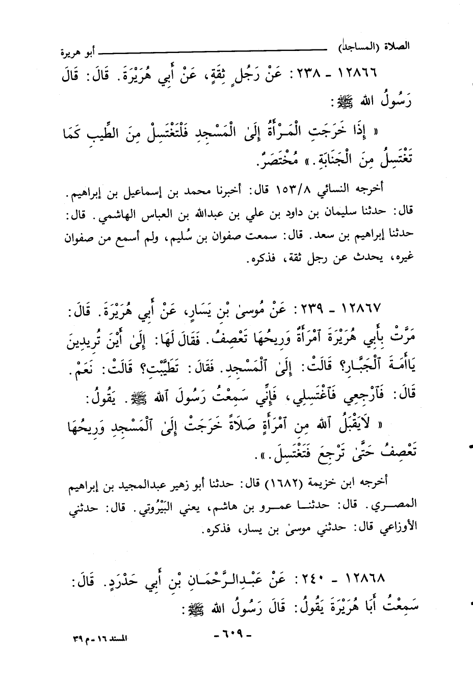 (إِذَا خَرَجَتِ الْمَرْأَةُ إِلَى الْمَسْجِدِ، فَلْتَغْتَسِلْ مِنَ الطِّيبِ، كَمَا تَغْتَسِلُ مِنَ الْجَنَابَةِ.))]]. مُخْتَصَرٌ.