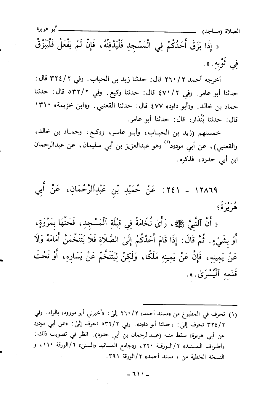 خمستهم (وكيع، وزيد بن الحباب، وأبو عامر، وحماد بن خالد، والقعنبي) عن أبي مودود، عبد العزيز بن أبى سليمان، عن عبد الرحمن بن أبي حدرد، فذكره.