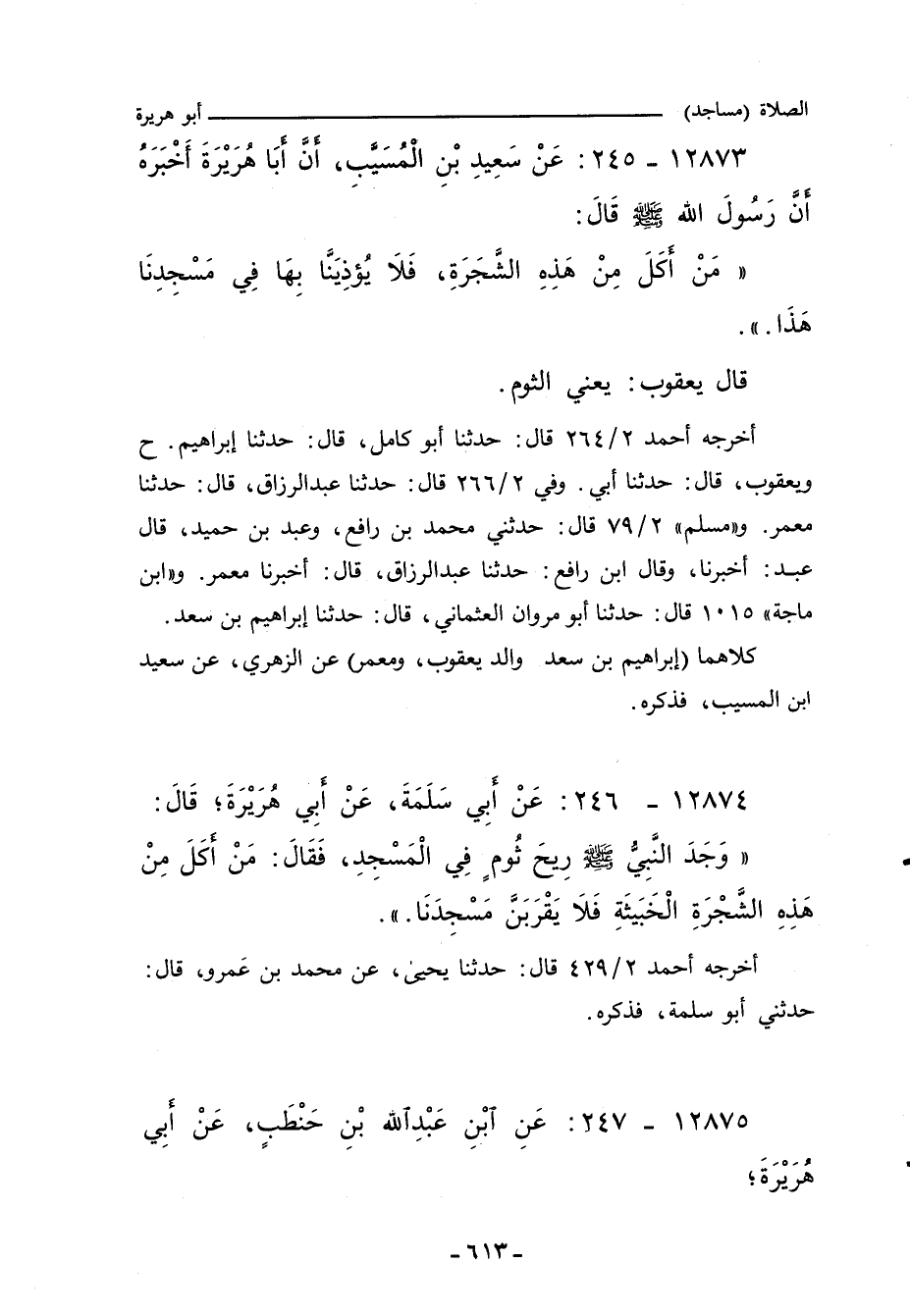 - في رواية ابن ماجة، قال إبراهيم بن سَعْد: وكان أبي يزيدُ فيه: الْكُرَّاثَ، وَالْبَصَلَ، عن النَّبِيِّ صلى الله عليه وسلم؛ يَعْني أنه يزيدُ على حديثِ أبي هُرَيرة في الثُّومِ.