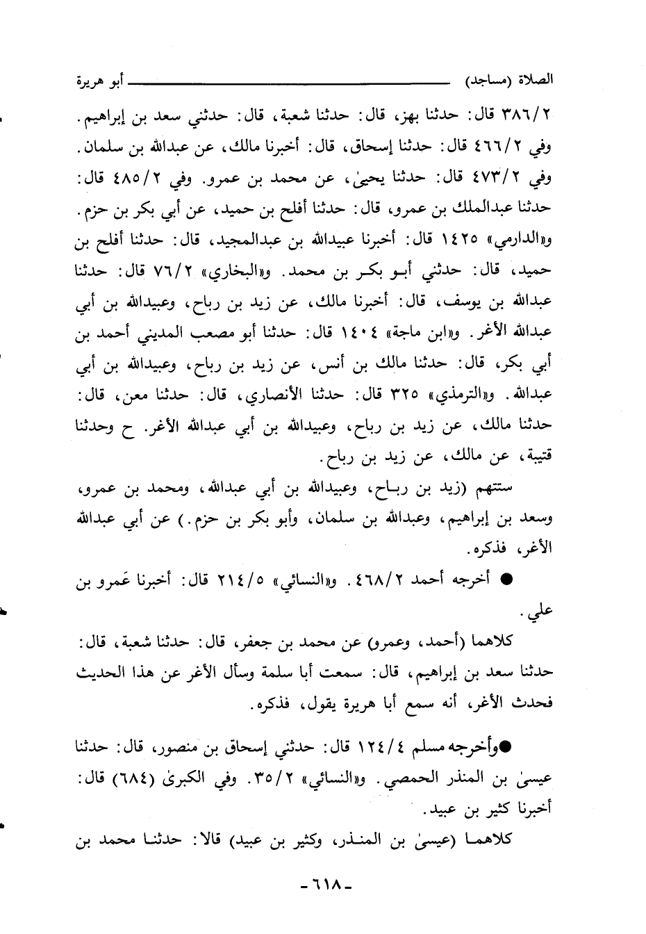 ٢/ ٣٨٦ (٩٠٠٠) قال: حدَّثنا بهز، حدَّثنا شعبة، قال: حدثني سعد بن إبراهيم. وفي ٢/ ٤٦٦ (١٠٠١٠) قال: حدَّثنا إسحاق، قال: أَخْبَرنا مالك، عن عبد الله بن سلمان. وفي ٢/ ٤٧٣ (١٠١١٧) قال: حدَّثنا يحيى، عن محمد بن عمرو. وفي ٢/ ٤٨٥ (١٠٣٠٤) قال: حدَّثنا عبد الملك بن عمرو، قال: حدَّثنا أفلح بن حميد، عن أبي بكر بن حزم. و ((الدارِمِي))]] ١٤١٨ قال: أَخْبَرنا عبيد الله بن عبد المجيد، حدَّثنا أفلح، هو ابن حميد، حدثني أبو بكر بن محمد. و ((البُخاري))]] ١١٩٠ قال: حدَّثنا عبد الله بن يوسف، قال: أَخْبَرنا مالك، عن زيد بن رباح، وعبيد الله بن أبي عبد الله الأغر. و ((ابن ماجة))]] ١٤٠٤ قال: حدَّثنا أبو مصعب المديني، أحمد بن أبي بكر، حدَّثنا مالك بن أنس، عن زيد بن رباح، وعبيد الله بن أبي عبد الله. و ((التِّرمِذي))]] ٣٢٥ قال: حدَّثنا الأنصاري، حدَّثنا معن، حدَّثنا مالك، عن زيد بن رباح، وعبيد الله بن أبي عبد الله الأغر (ح) وحدَّثنا قتيبة، عن مالك، عن زيد بن رباح. و ((أبو يَعْلَى))]] ٦١٦٦ قال: حدثنا يحيى بن أيوب، حدثنا إسماعيل بن جعفر، قال: أخبرني محمد. و ((ابن حبان))]] ١٦٢٥ قال: أَخْبَرنا عمر بن سعيد بن سنان، والحسين بن إدريس الأنصاري، قالا: أَخْبَرنا أحمد بن أبي بكر، عن مالك عن زيد بن رباح، وعبيد الله بن أبي عبد الله الأغر.