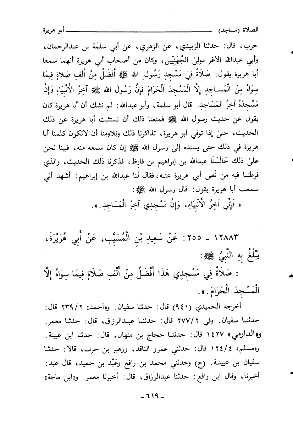 (صَلَاةٌ فِي مَسْجِدِ رَسُولِ اللهِ صلى الله عليه وسلم، أَفْضَلُ مِنْ أَلْفِ صَلَاةٍ فِيمَا سِوَاهُ مِنَ الْمَسَاجِدِ، إِلَاّ الْمَسْجِدَ الْحَرَامَ، فَإِنَّ رَسُولَ اللهِ صلى الله عليه وسلم آخِرُ الأَنْبِيَاءِ، وَإِنَّ مَسْجِدَهُ آخِرُ الْمَسَاجِدِ.) ".