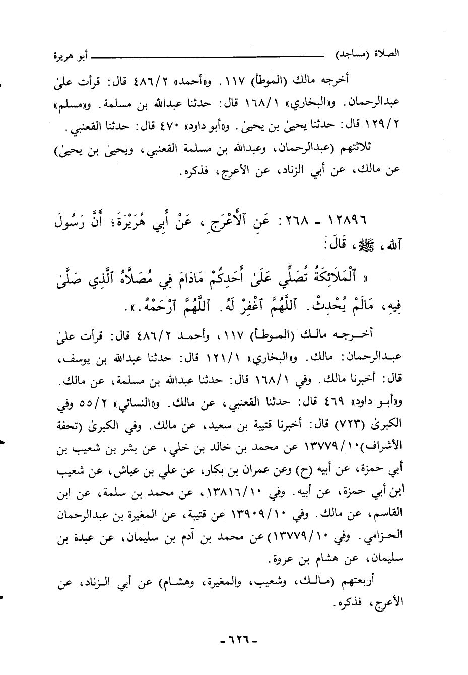 أخرجه مالك ((الموطأ))]] ١١٧. و ((أحمد))]] ٢/ ٤٢١ (٩٤٤٣) قال: قرأت على عبد الرحمن: مالك. و ((البُخاري))]] ٦٥٩ قال: حدَّثنا عبد الله بن مسلمة، عن مالك. و ((مسلم))]] ١٤٥٥ قال: حدَّثنا يحيى بن يحيى، قال: قرأتُ على مالك. و ((أبو داود))]] ٤٧٠ قال: حدَّثنا القعنبي، عن مالك. و ((أبو يَعْلَى))]] ٦٣٠٣ قال: حدثنا وهب، أَخْبَرنا خالد، عن عبد الرحمن.