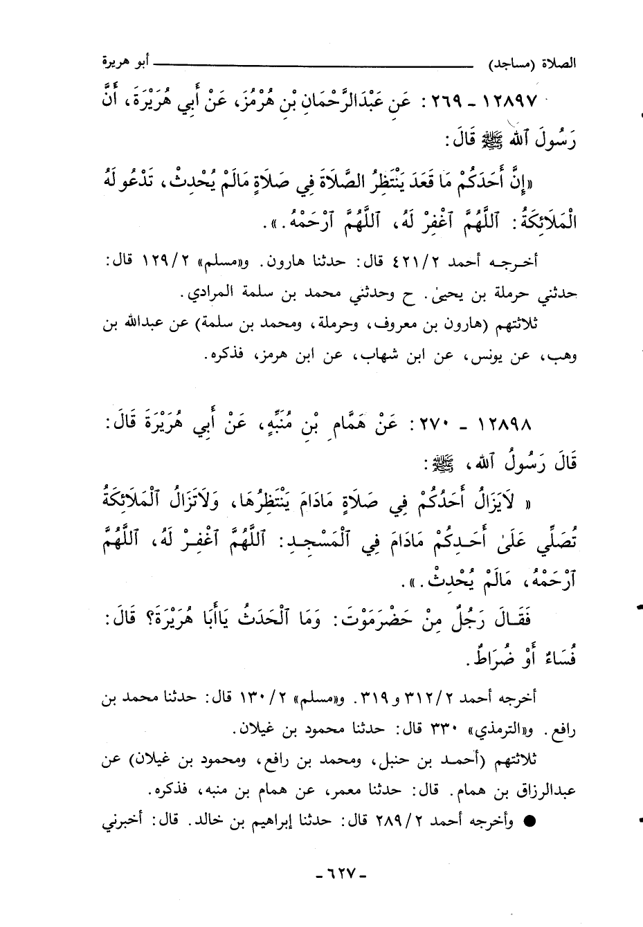 - وفي رواية: " (الْمَلَائِكَةُ تُصَلِّي عَلَى أَحَدِكُمْ مَا دَامَ فِي مُصَلَاّهُ الَّذِي صَلَّى فِيهِ، مَا لَمْ يُحْدِثِ: اللَّهُمَّ اغْفِرْ لَهُ، اللَّهُمَّ ارْحَمْهُ.) ".