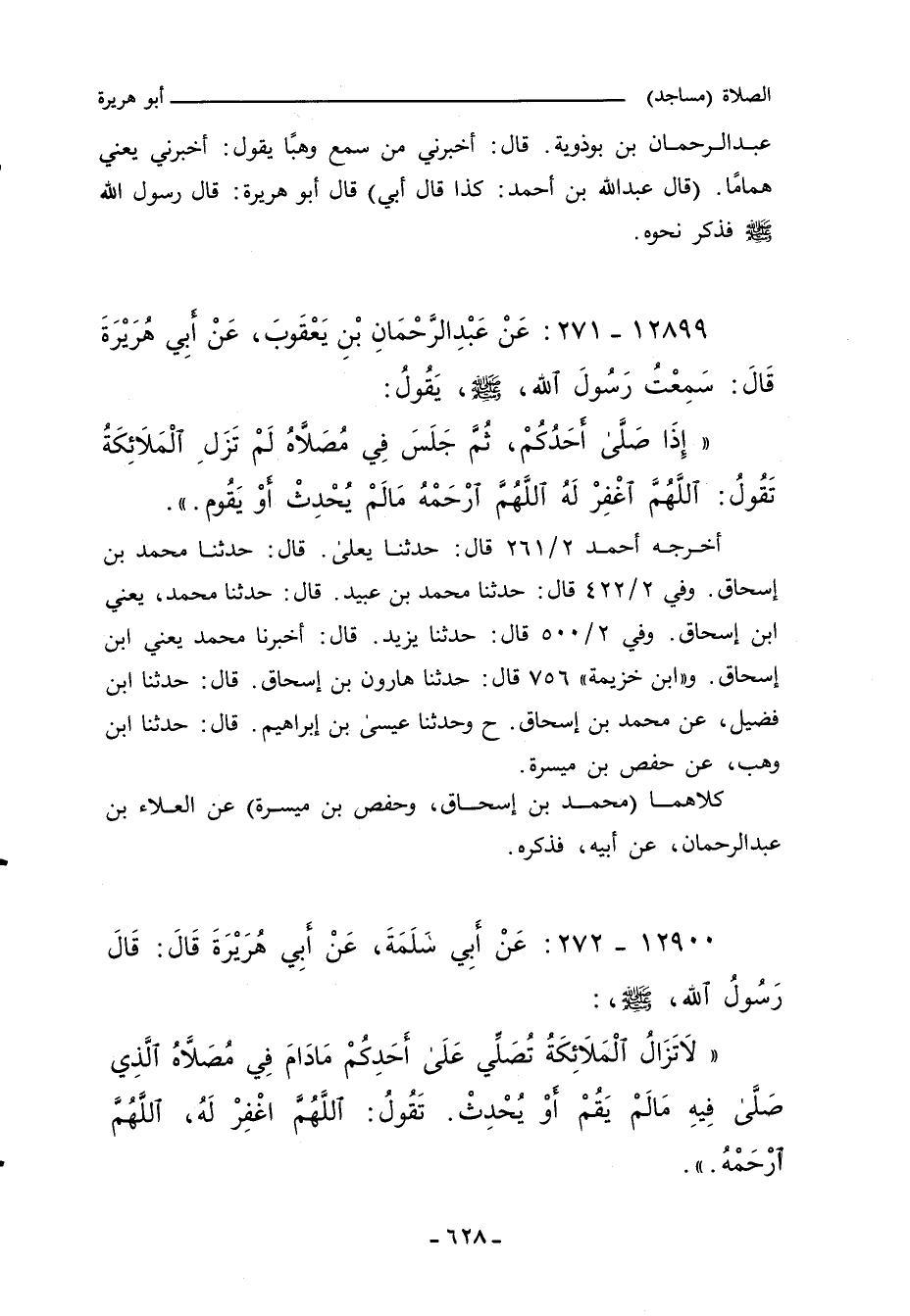 (لَا يَزَالُ أَحَدُكُمْ فِي صَلَاةٍ، مَا دَامَ يَنْتَظِرُ الَّتِي بَعْدَهَا، وَلَا تَزَالُ الْمَلَائِكَةُ تُصَلِّي عَلَى أَحَدِكُمْ مَا دَامَ فِي مَسْجِدِهِ، تَقُولُ: اللَّهُمَّ اغْفِرْ لَهُ، اللَّهُمَّ ارْحَمْهُ، مَا لَمْ يُحْدِثْ.) ".