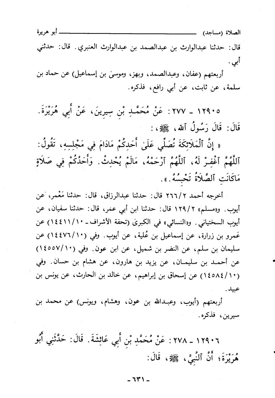 - وفي رواية: " (إِنَّ الْمَلَائِكَةَ تُصَلِّي عَلَى أَحَدِكُمْ مَا دَامَ فِي مَجْلِسِهِ، تَقُولُ: اللَّهُمَّ اغْفِرْ لَهُ، اللَّهُمَّ ارْحَمْهُ، مَا لَمْ يُحْدِثْ، وَأَحَدُكُمْ فِي صَلَاةٍ مَا كَانَتِ الصَّلَاةُ تَحْبِسُهُ.) ".