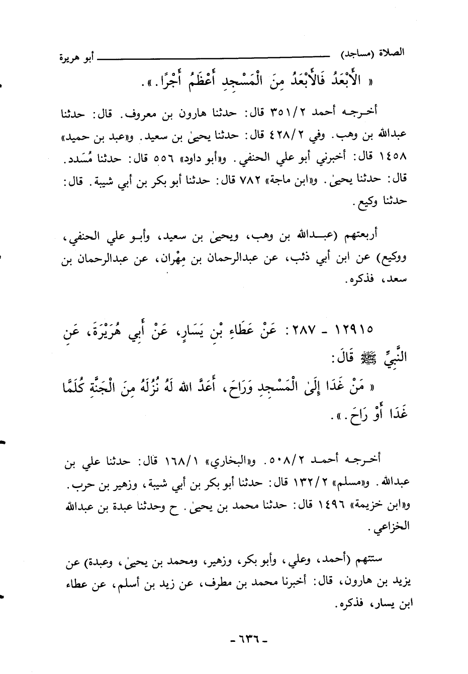 - وفي رواية: " (الأَبْعَدُ فَالأَبْعَدُ مِنَ الْمَسَاجِدِ أَعْظَمُ أَجْرًا.) ".