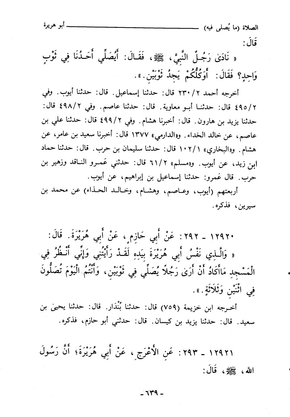 (وَالَّذِي نَفْسُ أَبِي هُرَيْرَةَ بِيَدِهِ لَقَدْ رَأَيْتُنِي وَإِنِّي أَنْظُرُ فِي الْمَسْجِدِ مَا أَكَادُ أَنْ أَرَى رَجُلاً يُصَلِّي فِي ثَوْبَيْنِ، وَأَنْتُمُ الْيَوْمَ تُصَلُّونَ فِي اثْنَيْنِ وَثَلَاثَةٍ.) ".