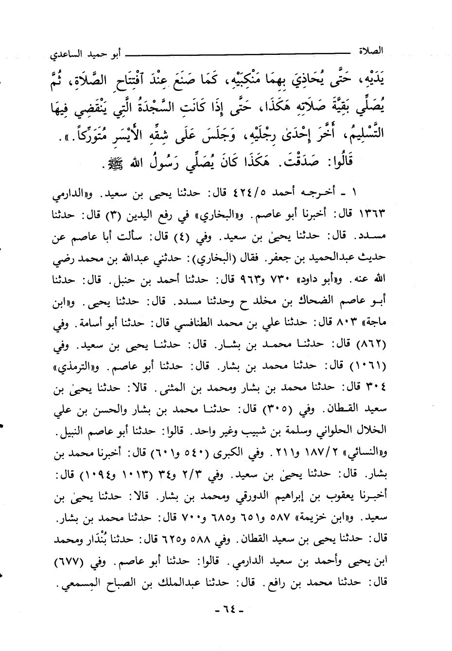 ١ - أخرجه ابن أَبي شَيْبَة ١/ ٢٣٥ (٢٤٣٨) ١/ ٢٨٨ (٢٩٦٤) قال: حدَّثنا هشيم. و"أحمد" ٥/ ٤٢٤ (٢٣٩٩٧) قال: حدَّثنا يحيى بن سعيد. و"الدارِمِي" ١٣٥٦ قال: أَخْبَرنا أبو عاصم. (خ ي) ٣ قال: حدَّثنا مسدد، قال: حدَّثنا يحيى بن سعيد. وفي (٤) قال: سألت أبا عاصم عن حديث عبد الحميد بن جعفر. فقال البخاري: حدثني عبد الله بن محمد رضي الله عنه. و"أبو داود" ٧٣٠ و ٩٦٣ قال: حدَّثنا أحمد بن حنبل، حدَّثنا أبو عاصم، الضحاك بن مخلد (ح) وحدثنا مسدد، حدَّثنا يحيى. و"ابن ماجة" ٨٠٣ قال: حدَّثنا علي بن محمد الطنافسي، حدَّثنا أبو أسامة. وفي (٨٦٢) قال: حدَّثنا محمد بن بشار، حدَّثنا يحيى بن سعيد. وفي (١٠٦١) قال: حدَّثنا محمد بن بشار، حدَّثنا أبو عاصم. و"التِّرمِذي" ٣٠٤ قال: حدَّثنا محمد بن بشار، ومحمد بن المثنى، قالا: حدَّثنا يحيى بن سعيد القطان. وفي (٣٠٥) قال: حدَّثنا محمد بن بشار، والحسن بن علي الخلال الحلواني، وسلمة بن شبيب، وغير واحد، قالوا: حدَّثنا أبو عاصم النبيل. و"النَّسائي" ٢/ ١٨٧ و ٢/ ٢١١، وفي "الكبرى" ٦٣١ و ٦٩٢ قال: أَخْبَرنا محمد بن بشار، قال: حدَّثنا يحيى بن سعيد. وفي ٣/ ٢ و ٣/ ٣٤، وفي "الكبرى" ١١٠٥ و ١١٨٦ قال: أَخْبَرنا يعقوب بن إبراهيم الدورقي، ومحمد بن بشار، قالا: حدَّثنا يحيى بن سعيد. و"ابن خزيمة" ٥٨٧ و ٦٥١ و ٦٨٥ و ٧٠٠ قال: حدَّثنا محمد بن بشار، حدَّثنا يحيى بن سعيد القطان. وفي (٥٨٨ و ٦٢٥) قال: حدَّثنا بُنْدَار، ومحمد بن يحيى، وأحمد بن سعيد الدارمي، قالوا: حدَّثنا أبو عاصم. وفي (٦٧٧) قال: حدَّثنا محمد بن رافع، حدَّثنا عبد الملك بن الصباح المِسمعي.