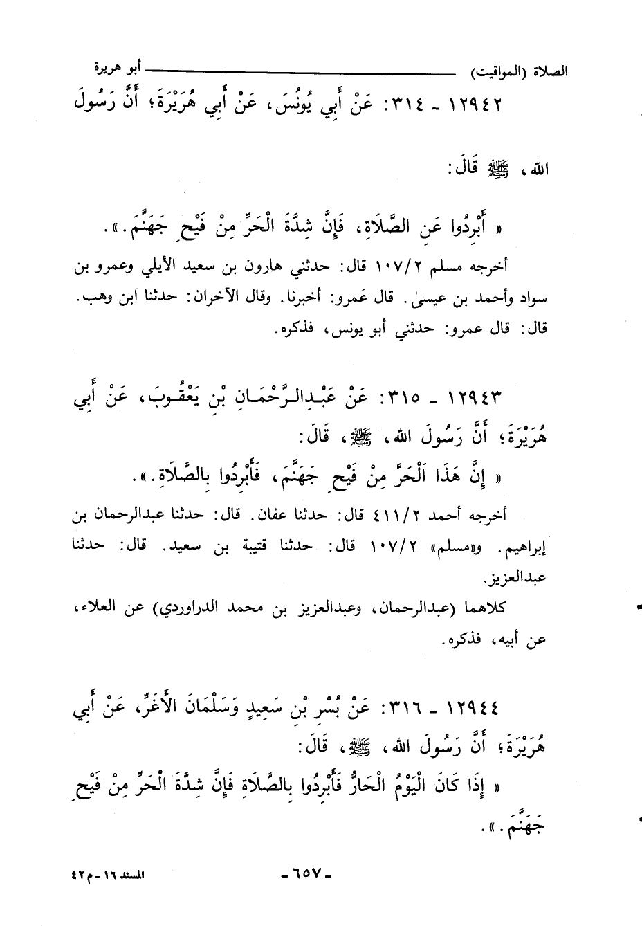 (أَبْرِدُوا عَنِ الصَّلَاةِ، فَإِنَّ شِدَّةَ الْحَرِّ مِنْ فَيْحِ جَهَنَّمَ.) ".