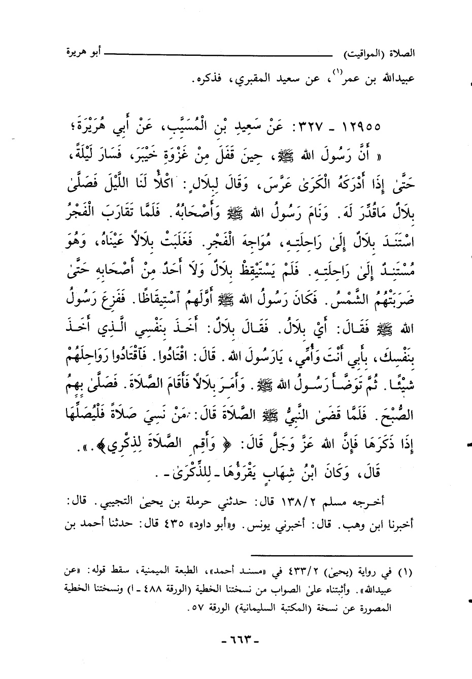 (أَنَّ رَسُولَ اللهِ صلى الله عليه وسلم حِينَ قَفَلَ مِنْ غَزْوَةِ خَيْبَرَ، سَارَ لَيْلَهُ، حَتَّى إِذَا أَدْرَكَهُ الْكَرَى عَرَّسَ، وَقَالَ لِبِلَالٍ: اكْلأْ لَنَا اللَّيْلَ، فَصَلَّى بِلَالٌ مَا قُدِّرَ لَهُ، وَنَامَ رَسُولُ اللهِ صلى الله عليه وسلم وَأَصْحَابُهُ، فَلَمَّا تَقَارَبَ الْفَجْرُ اسْتَنَدَ بِلَالٌ إِلَى رَاحِلَتِهِ مُوَاجِهَ الْفَجْرِ، فَغَلَبَتْ بِلَالاً عَيْنَاهُ، وَهُوَ مُسْتَنِدٌ إِلَى رَاحِلَتِهِ، فَلَمْ يَسْتَيْقِظْ رَسُولُ اللهِ صلى الله عليه وسلم، وَلَا بِلَالٌ، وَلَا أَحَدٌ مِنْ أَصْحَابِهِ، حَتَّى ضَرَبَتْهُمُ الشَّمْسُ، فَكَانَ رَسُولُ اللهِ صلى الله عليه وسلم أَوَّلَهُمُ اسْتِيقَاظًا، فَفَزِعَ رَسُولُ اللهِ صلى الله عليه وسلم، فَقَالَ: أَيْ بِلَالُ، فَقَالَ بِلَالٌ: أَخَذَ بِنَفْسِي الَّذِي أَخَذَ، بِأَبِي أَنْتَ وَأُمِّي يَا رَسُولَ اللهِ، بِنَفْسِكَ، قَالَ: اقْتَادُوا، فَاقْتَادُوا رَوَاحِلَهُمْ شَيْئًا، ثُمَّ تَوَضَّأَ رَسُولُ اللهِ صلى الله عليه وسلم، وَأَمَرَ بِلَالاً فَأَقَامَ الصَّلَاةَ، فَصَلَّى بِهِمُ الصُّبْحَ، فَلَمَّا قَضَى الصَّلَاةَ، قَالَ: مَنْ نَسِيَ الصَّلَاةَ فَلْيُصَلِّهَا إِذَا ذَكَرَهَا، فَإِنَّ اللهَ قَالَ: "أَقِمِ الصَّلَاةَ لِذِكْرِي".) ".